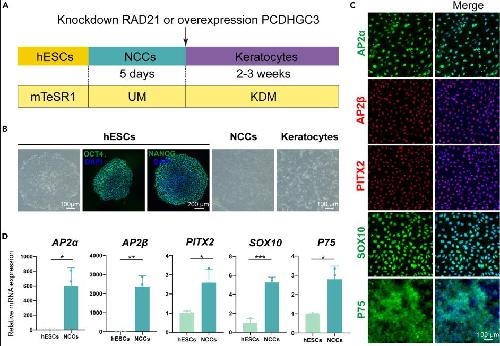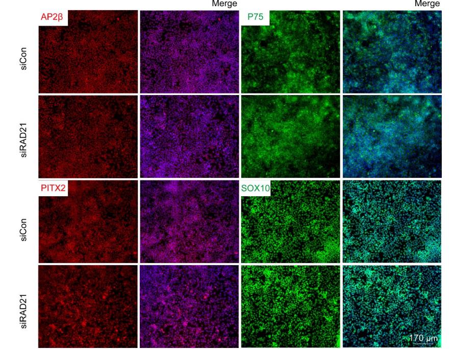 Fig S3 Immunofluorescence staining of NCCs with knockdown of RAD21, related to Figure 2. RAD21 knockdown was initiated during the differentiation of hESCs into the NCCs. Immunofluorescence staining for specific markers, including AP2β, SOX10, PITX2, and P75, in NCCs was conducted one week after the hESC differentiation. |