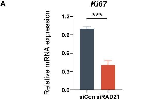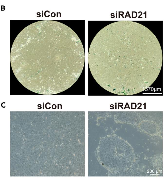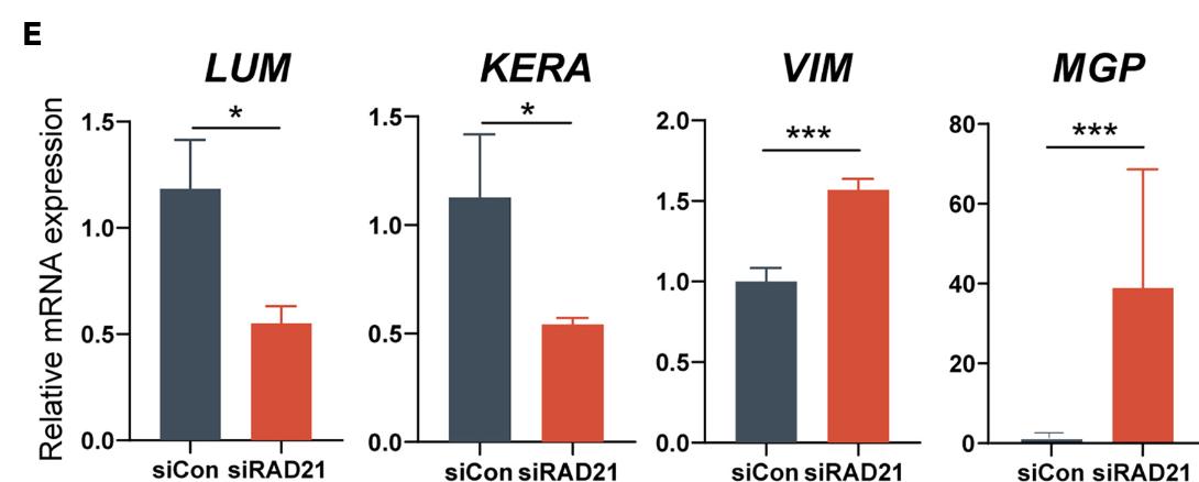 Figure 2. Impact of RAD21 deficiency on NCC activity (A) Ki67 exhibited 0.4-fold lower in the siRAD21 group compared to the siCon group. n = 3. (B) During the NCC differentiation process, SA-β-Gal staining revealed enhanced senescence features in NCCs with RAD21 deficiency. Scale bar = 1370 μm. n = 3. (C) During NCC differentiation into keratocytes, RAD21 knockdown cells exhibited clustering. Scale bar = 200 μm. n = 3. (D) Immunofluorescence staining at the end of differentiation revealed lower expression of KERA in the siRAD21 group compared to the siCon group, while VIM was more enriched in the siRAD21 group than in the siCon group. The siRAD21 group displayed reduced cell numbers and clustered growth. Scale bar = 200 μm. (E) qPCR displayed consistent expression trends for KERA and VIM as observed in (D). The scleral marker MGP exhibited 38.9-fold higher in the siRAD21 group compared to the siCon group according to RNA sequencing data. Data are presented as mean ± standard deviation. n = 3. ∗p < 0.05, ∗∗∗p < 0.001. |