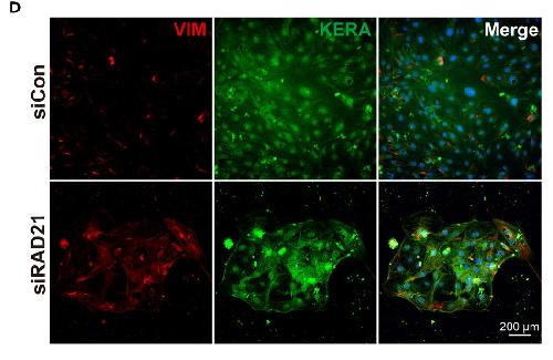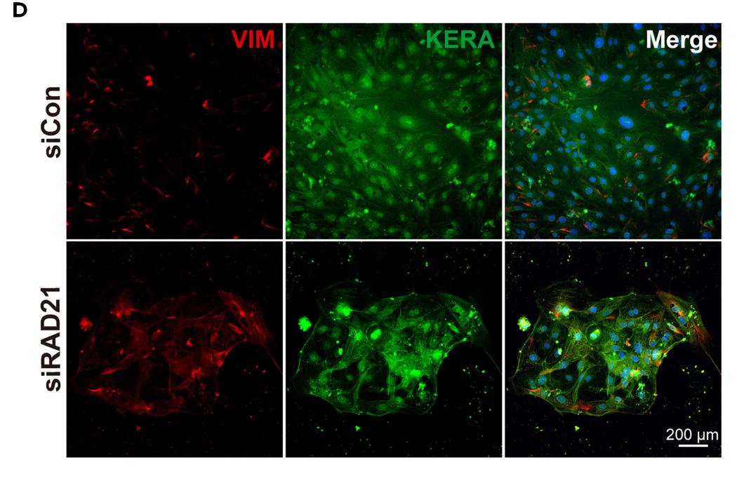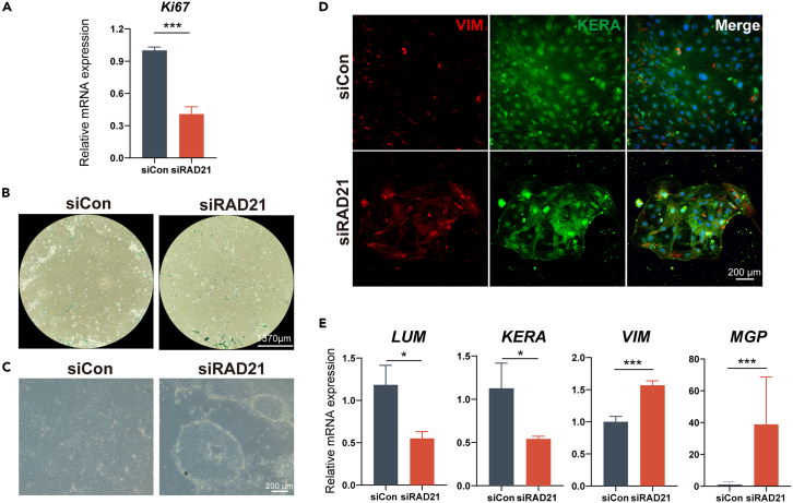 Figure 2. Impact of RAD21 deficiency on NCC activity(A) Ki67 exhibited 0.4-fold lower in the siRAD21 group compared to the siCon group. n = 3.(B) During the NCC differentiation process, SA-β-Gal staining revealed enhanced senescence features in NCCs with RAD21 deficiency. Scale bar = 1370 μm. n = 3.(C) During NCC differentiation into keratocytes, RAD21 knockdown cells exhibited clustering. Scale bar = 200 μm. n = 3.(D) Immunofluorescence staining at the end of differentiation revealed lower expression of KERA in the siRAD21 group compared to the siCon group, while VIM was more enriched in the siRAD21 group than in the siCon group. The siRAD21 group displayed reduced cell numbers and clustered growth. Scale bar = 200 μm.(E) qPCR displayed consistent expression trends for KERA and VIM as observed in (D). The scleral marker MGP exhibited 38.9-fold higher in the siRAD21 group compared to the siCon group according to RNA sequencing data. Data are presented as mean ± standard deviation. n = 3. ∗p < 0.05, ∗∗∗p < 0.001. |