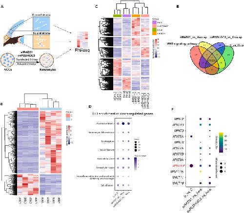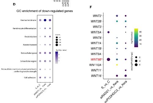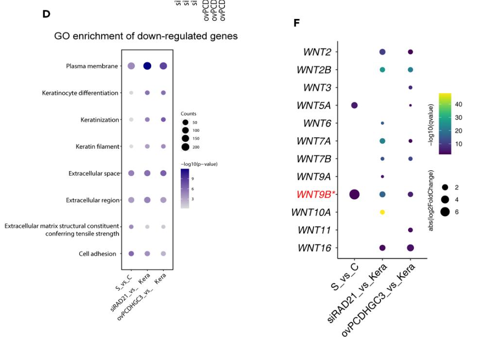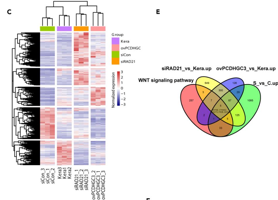 Figure 4. Transcriptome analysis (A) Transcriptome sequencing sample schematic. Four human corneal stroma samples (group C), four human scleral stroma samples (group S), and NCCs with RAD21 knockdown (siRAD21) or NCCs with PCDHGC3 overexpression (ovPCDHGC3) were also sequenced. (B) Hierarchical clustering heatmap of differentially expressed genes in different samples (S and C). (C) Hierarchical clustering heatmap of differentially expressed genes in different samples (siRAD21, ovPCDHGC3, Kera, and siCon). (D) Top GO terms for commonly downregulated genes in siRAD21 vs. Kera, ovPCDHGC3 vs. Kera, and S vs. C conditions. (E) A Venn diagram illustrated the common upregulated genes in siRAD21 vs. Kera, ovPCDHGC3 vs. Kera, and S vs. C conditions with canonical WNT signaling pathway genes. (F) Bubble map of the WNT gene family illustrated genes with significant differences common to siRAD21 vs. Kera, ovPCDHGC3 vs. Kera, and S vs. C. |