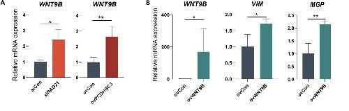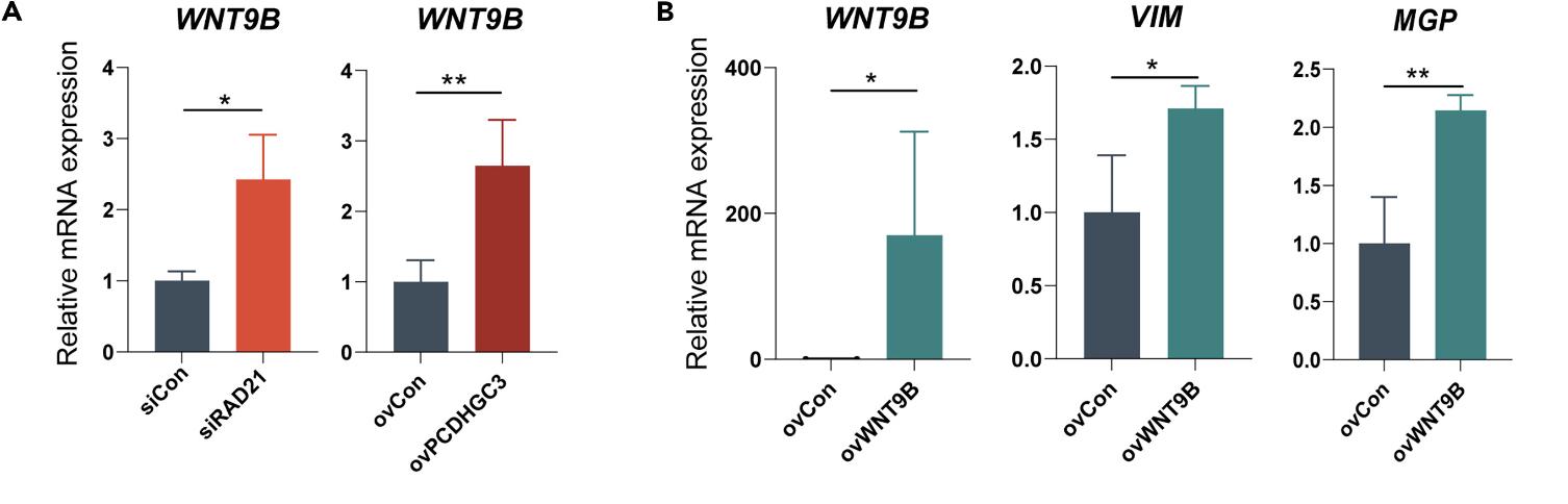 Figure 5. Knock down of WNT9B rescues defects in RAD21 (A) WNT9B exhibited 2.4-fold higher in the siRAD21 group compared to the siCon group and 2.6-fold higher in the ovPCDHGC3 group compared to the ovCon group. n = 3. (B) qPCR analysis of the efficiency of overexpression of WNT9B in NCCs. n = 3. At the end of differentiation, VIM and MGP exhibited 1.7-fold and 2.1-fold higher in the ovWNT9B group compared to the ovCon group. n = 3. (C) Knock down of WNT9B in RAD21-deficient NCCs served as a rescue strategy, and restored gene expression in KERA, VIM, LUM, and MGP. n = 3. (D) Time-lapse images at time 0, 12, and 24 h post-scratching. Scale bar = 200 μm. (E) Quantitative analysis of (D). At 12 h and 24 h, the wound healing area of the rescue group was 1.3-fold higher and 1.2-fold higher compared to the siRAD21 group, resembling that of the siCon group. n = 3. (F) The transwell assay detects cell migration. (G) Quantitative analysis of (F). The number of migratory cells in the rescue group was 4.9-fold higher than in the siRAD21 group and being 0.8-fold of the siCon group. Data are presented as mean ± standard deviation. n = 3. ∗p < 0.05, ∗∗p < 0.01, ∗∗∗p < 0.001, ns, no significance. |