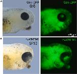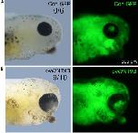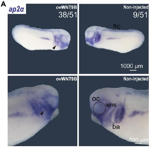 Figure 7. ovWNT9b affected eye development (A) At the two-cell stage of embryonic development, GFP was injected into one cell. At stage 41, there was no obvious abnormality in eye morphology developed from the injected cell. Scale bar = 500 μm. (B) At the two-cell stage of embryonic development, a combination of wnt9b and GFP was injected into one cell. At stage 41, 90% of eyes with wnt9b overexpression were malformed. Scale bar = 500 μm. |