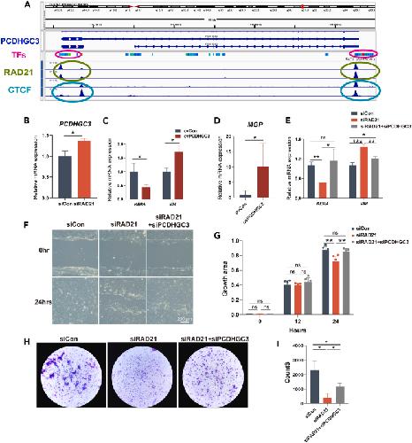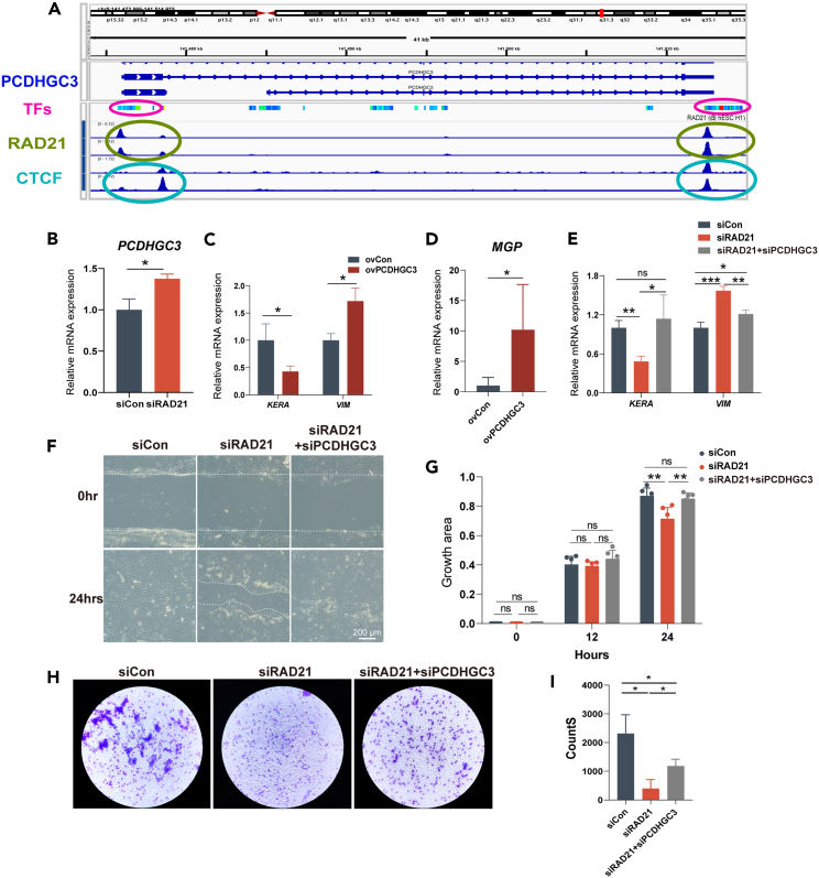 Figure 3. RAD21 induced upregulation of PCDHGC3(A) Peaks of RAD21 (green circles), CTCF (blue circles), and TFs (red circles) are observed in both upstream and downstream of the PCDHGC3 gene.(B) qPCR analysis revealed upregulated PCDHGC3 expression in siRAD21-treated NCCs. PCDHGC3 exhibited 1.4-fold higher in the siRAD21 group than in the siCon group. n = 3.(C) At the end of differentiation, KERA exhibited 0.4-fold lower and VIM exhibited 1.7-fold higher in the ovPCDHGC3 group compared to the ovCon group. n = 3.(D) The scleral marker MGP exhibited 10.2-fold higher in the ovPCDHGC3 group compared to the ovCon group according to RNA sequencing data. n = 3.(E) Knock down of PCDHGC3 in RAD21-deficient NCCs served as a rescue strategy, and restored gene expression in KERA and VIM. n = 3.(F) Time-lapse images at time 0 and 24 h post-scratching. Scale bar = 200 μm.(G) Quantitative analysis of (F). At 24 h, the wound healing area of the rescue group was 1.2-fold higher than that of the siRAD21 group, resembling that of the siCon group. n = 3.(H) The transwell assay detects cell migration.(I) Quantitative analysis of (H). The number of migratory cells in the rescue group was 2.9-fold higher than in the siRAD21 group. Data are presented as mean ± standard deviation. n = 3. ∗p < 0.05, ∗∗p < 0.01, ∗∗∗p < 0.001, ns, no significance. |