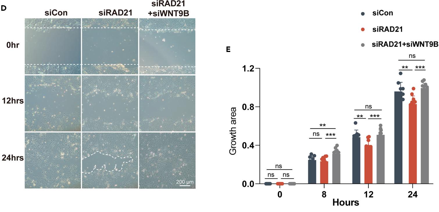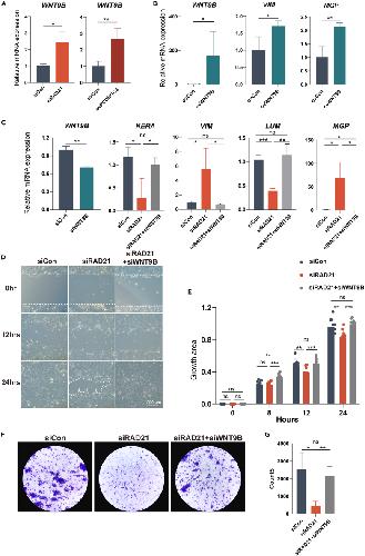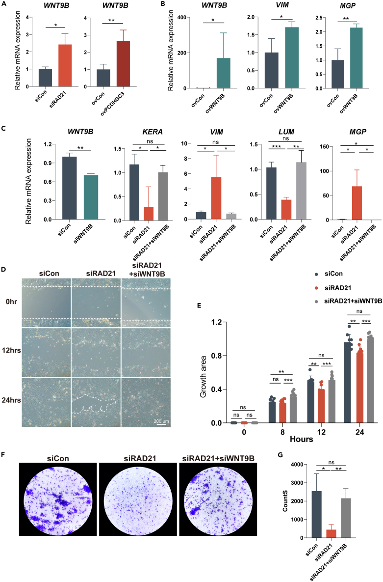 Figure 5. Knock down of WNT9B rescues defects in RAD21(A) WNT9B exhibited 2.4-fold higher in the siRAD21 group compared to the siCon group and 2.6-fold higher in the ovPCDHGC3 group compared to the ovCon group. n = 3.(B) qPCR analysis of the efficiency of overexpression of WNT9B in NCCs. n = 3. At the end of differentiation, VIM and MGP exhibited 1.7-fold and 2.1-fold higher in the ovWNT9B group compared to the ovCon group. n = 3.(C) Knock down of WNT9B in RAD21-deficient NCCs served as a rescue strategy, and restored gene expression in KERA, VIM, LUM, and MGP. n = 3.(D) Time-lapse images at time 0, 12, and 24 h post-scratching. Scale bar = 200 μm.(E) Quantitative analysis of (D). At 12 h and 24 h, the wound healing area of the rescue group was 1.3-fold higher and 1.2-fold higher compared to the siRAD21 group, resembling that of the siCon group. n = 3.(F) The transwell assay detects cell migration.(G) Quantitative analysis of (F). The number of migratory cells in the rescue group was 4.9-fold higher than in the siRAD21 group and being 0.8-fold of the siCon group. Data are presented as mean ± standard deviation. n = 3. ∗p < 0.05, ∗∗p < 0.01, ∗∗∗p < 0.001, ns, no significance. |