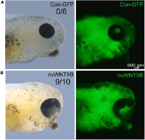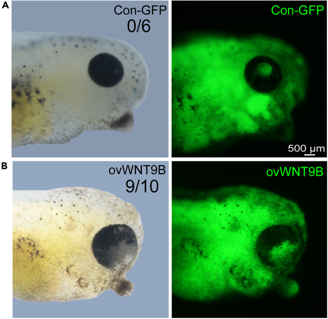 Figure 7. ovWNT9b affected eye development(A) At the two-cell stage of embryonic development, GFP was injected into one cell. At stage 41, there was no obvious abnormality in eye morphology developed from the injected cell. Scale bar = 500 μm.(B) At the two-cell stage of embryonic development, a combination of wnt9b and GFP was injected into one cell. At stage 41, 90% of eyes with wnt9b overexpression were malformed. Scale bar = 500 μm. |