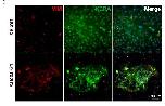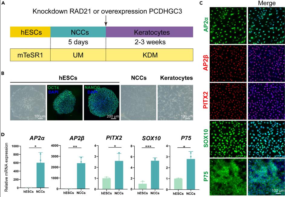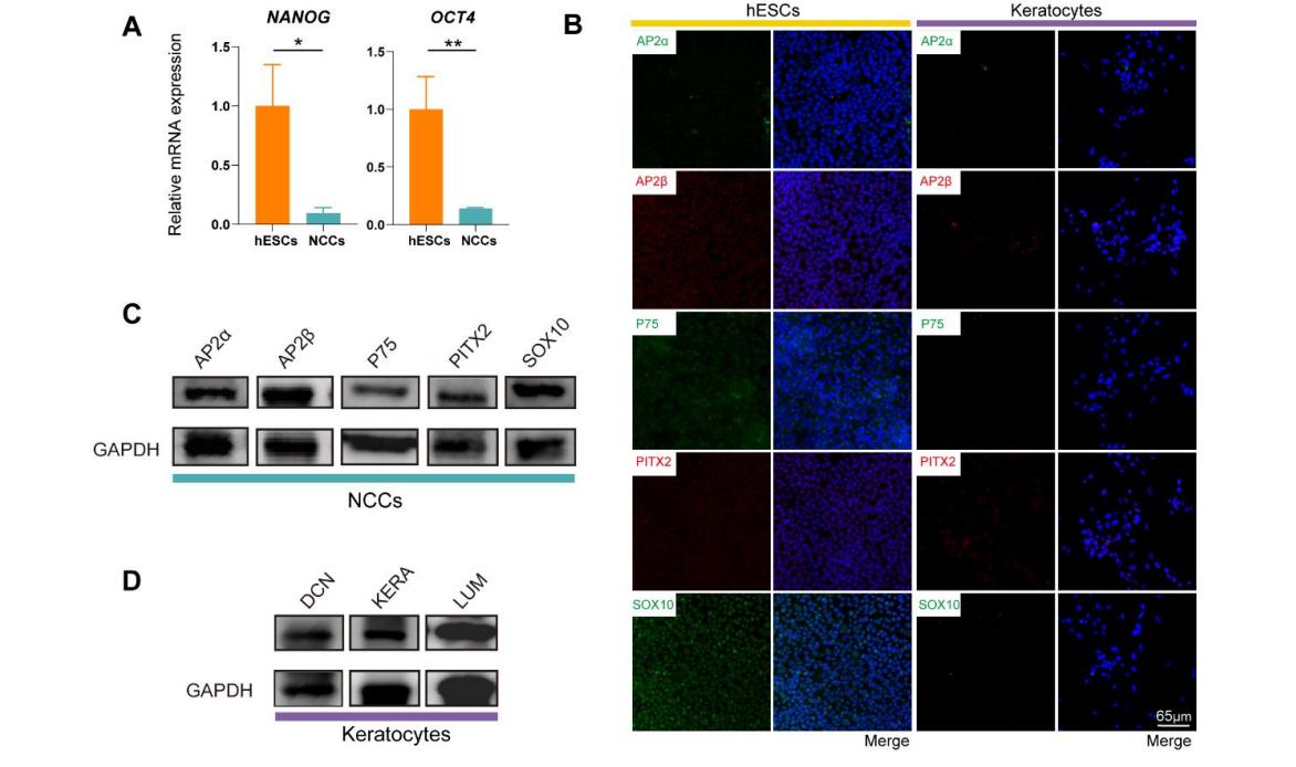 Fig S1 Differentiation of corneal keratocytes from hESCs, related to Figure 1. (A) The expression of pluripotency markers NANOG and OCT4 were 0.1-fold and 0.1- fold lower in NCCs than in hESCs. n = 3. (B) Immunofluorescence staining was conducted to assess the expression of NCCs markers in both hESCs and keratocytes. (C) Western blot detection of NCCs specific for markers AP2α, AP2β, P75, PITX2, and SOX10. (D) Western blot detection of keratocytes specific for markers DCN, KERA, LUM. *P < 0.05, **P < 0.01. |