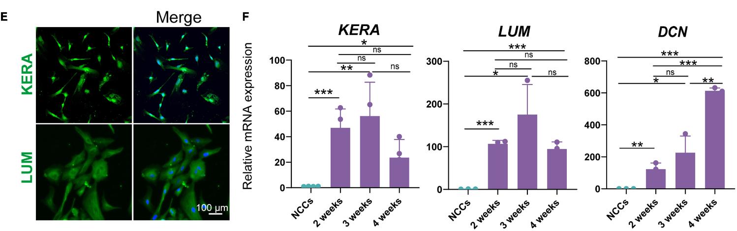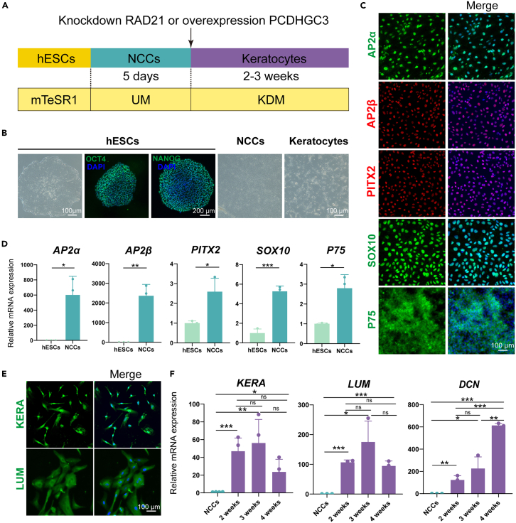 Figure 1. Differentiation of corneal keratocytes from hESCs(A) Schematic representation of the methodology employed to induce the differentiation of hESCs into NCCs and subsequently into corneal keratocytes. NCCs were generated by incubating hESCs in NDM supplemented with 4 ng/mL bFGF and 1 μM RA for 5 days. To differentiate into keratocytes, the medium was switched to KDM containing 10 ng/mL bFGF for 2–3 weeks.(B) Fluorescence microscopy images depicting hESCs, NCCs, and keratocytes. Scale bar = 100 μm. The immunostaining staining of pluripotency markers OCT4 and NANOG in hESCs showed positive. Nuclei were counterstained with DAPI. Scale bar = 200 μm.(C) Representative immunofluorescence staining showing the expression of NCC markers, including P75, PITX2, AP2β, and SOX10. Nuclei were counterstained with DAPI. Scale bar = 100 μm.(D) qPCR analysis of gene expression of NCC markers. n = 3.(E) Representative immunofluorescence staining of keratocyte markers KERA and LUM. Nuclei were counterstained with DAPI. Scale bar = 100 μm.(F) qPCR analysis of gene expression of keratocyte markers. n = 3. Data are presented as mean ± standard deviation. ∗p < 0.05, ∗∗p < 0.01, ∗∗∗p < 0.001, ns, no significance. |