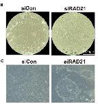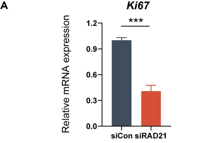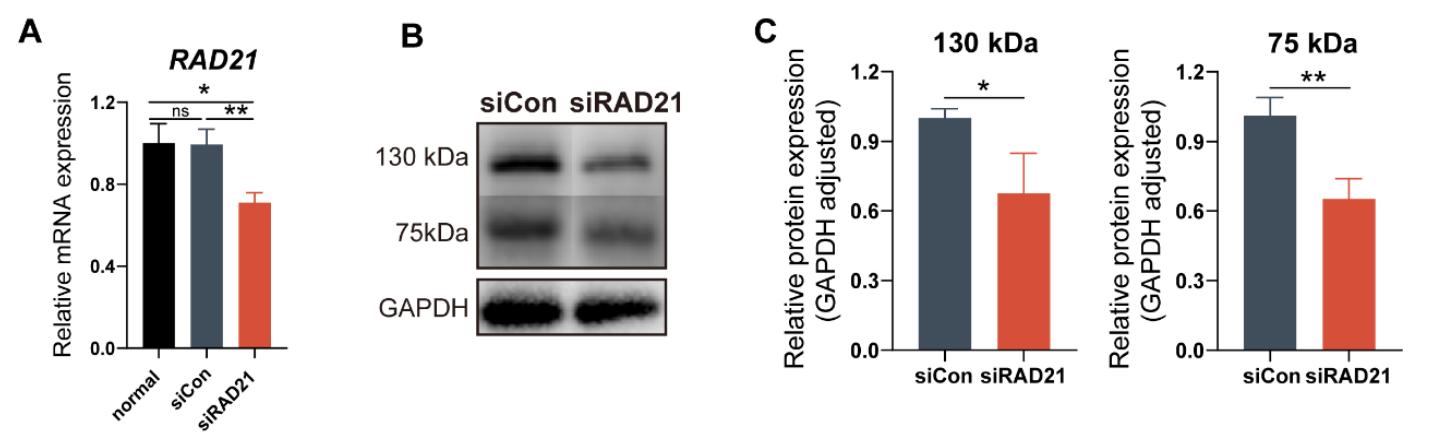 Fig S2 Knockdown of RAD21 in NCCs, related to Figure 2. (A) NCCs were subjected to siRAD21 transfection, the siRAD21 group exhibited a 29% reduction in RAD21. n = 3. (B) Western blot analysis of RAD21 expression in NCCs 5 days posttransfection. RAD21 protein levels was decrease of 32.5% for the 130 kDa full length RAD21 and 34.8% for the 75 kDa cleaved RAD21. (C) Quantification of RAD21 levels relative to siCon from (B). n = 3. *P < 0.05, **P < 0.01. |