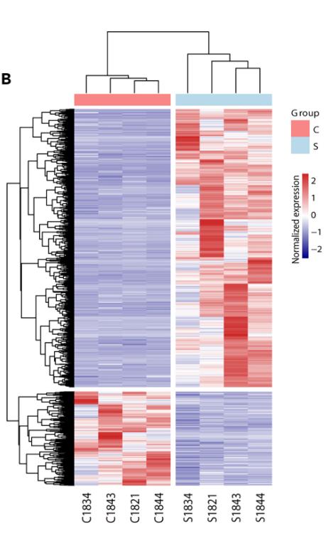 Fig S4 Transcriptome analysis, related to Figure 4. (A) Top GO terms associated with upregulated genes (S vs C). (B) Top GO terms related to downregulated genes (S vs C). |