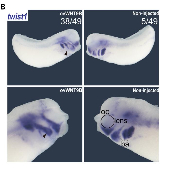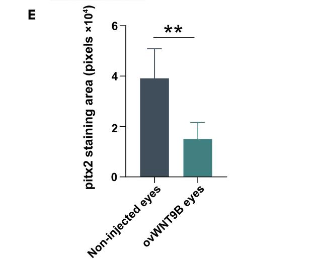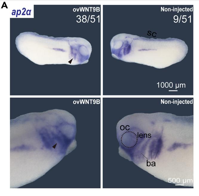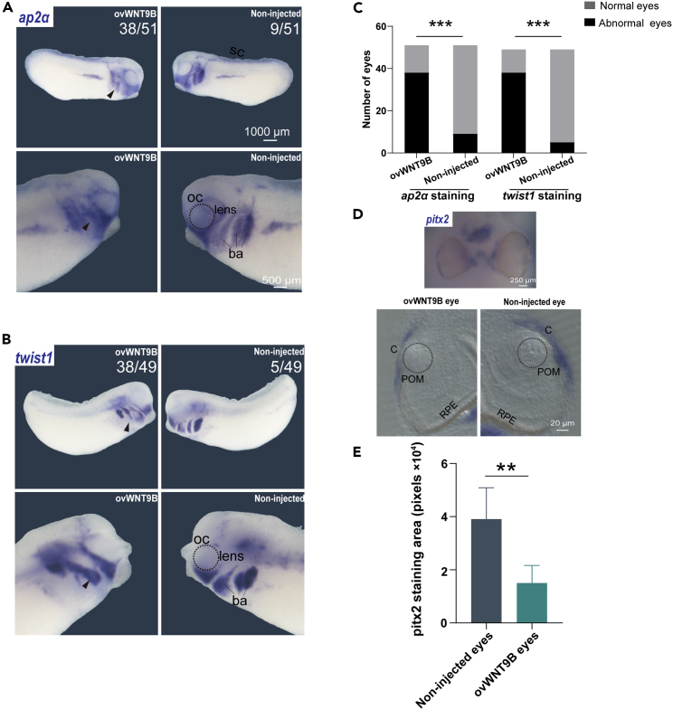 Figure 6. ovWNT9B affected NCCs Migration in X. tropicalis(A) At stage 28, the in situ hybridization pattern of ap2a on the non-injected side of the same embryo shows intact and clear NCC migration around the oc and three ba. In contrast, on the ovWNT9B side, these structures are disrupted (38/51). Scale bar upper panel = 1000 μm, lower panel = 500 μm.(B) At stage 28, the in situ hybridization pattern of twist1 on the non-injected side of the same embryo shows intact and clear NCC migration around the oc and three ba, while on the ovWNT9B side a delayed NCC migration was observed (38/49). Scale bar upper panel = 1000 μm, lower panel = 500 μm.(C) Number of embryos with normal and abnormal NCC migration in each group.(D) The in situ hybridization of pitx2 at stage 41. Both the ovWNT9B eye and the non-injected eye, as well as their ocular sections, were shown. n = 5. Scale bar upper panel = 250 μm, lower panel = 20 μm.(E) Quantitative analysis of the pitx2-positive area in the POM of non-injected eyes and eyes with wnt9b overexpression. Data are presented as mean ± standard deviation. n = 5. ∗∗p < 0.01. ∗∗∗p < 0.001. |