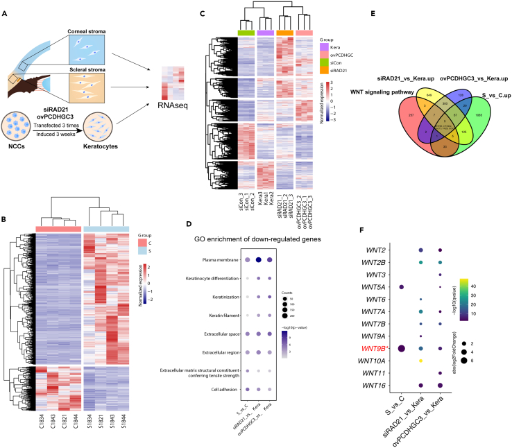 Figure 4. Transcriptome analysis(A) Transcriptome sequencing sample schematic. Four human corneal stroma samples (group C), four human scleral stroma samples (group S), and NCCs with RAD21 knockdown (siRAD21) or NCCs with PCDHGC3 overexpression (ovPCDHGC3) were also sequenced.(B) Hierarchical clustering heatmap of differentially expressed genes in different samples (S and C).(C) Hierarchical clustering heatmap of differentially expressed genes in different samples (siRAD21, ovPCDHGC3, Kera, and siCon).(D) Top GO terms for commonly downregulated genes in siRAD21 vs. Kera, ovPCDHGC3 vs. Kera, and S vs. C conditions.(E) A Venn diagram illustrated the common upregulated genes in siRAD21 vs. Kera, ovPCDHGC3 vs. Kera, and S vs. C conditions with canonical WNT signaling pathway genes.(F) Bubble map of the WNT gene family illustrated genes with significant differences common to siRAD21 vs. Kera, ovPCDHGC3 vs. Kera, and S vs. C. |