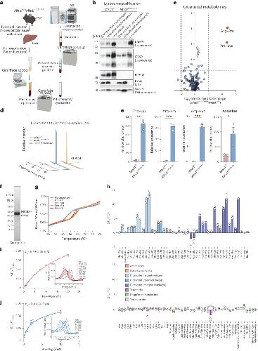 Fig. 1. Mfsd1-knockout mice accumulate cationic dipeptides in liver lysosomes, and recombinant MFSD1 binds various dipeptides.a, A schematic representation of lysosome enrichment by ultracentrifugation and untargeted metabolomics. b, Immunoblot analysis of PNS, mitochondria and lysosome-enriched fractions and the final lysosome-enriched fraction from WT and Mfsd1-knockout mice for markers of various cellular compartments. ER, endoplasmic reticulum. c, Volcano plot of differential metabolites between liver lysosomes of WT and Mfsd1-knockout mice (two-sided one-way analysis of variance with Tukey’s post hoc test, adjustment for multiple testing). d, Extracted ion chromatogram (EIC) for the chemical standard Pro–Arg (yellow, 100 nM) and representative samples from WT (red) and Mfsd1-knockout mice (blue). Pro–Arg is detected as a peak eluting at a retention time (RT) of 8.44 min. e, Relative abundance of Pro–Lys, Arg–Pro and anserine between WT and Mfsd1-knockout mice. The abundance was normalized to the isotopically labelled arginine levels, which showed no differences between the two genotypes in the untargeted metabolomic analysis (two-tailed unpaired t-tests). The data are means ± s.e.m. N = 5 for the animals/genotype (*P ≤ 0.05 and ***P ≤ 0.001). f, Coomassie-stained SDS–PAGE gel of purified MFSD1 with a Twin-Strep-tag that was transiently expressed in Expi293F cells and purified to homogeneity in DDM/CHS detergent solution. g, Unfolding traces of MFSD1 in the absence and presence of Ala–Ala, Pro–Arg, Leu–Ala and Lys–Val at a concentration of 5 mM. h, Thermal stability of MFSD1 in the presence of a compound library at a 5 mM final ligand concentration. The ΔTm of MFSD1 are given as a difference to the melting temperature of apo MFSD1 (Tm(apo)). The data are means ± s.e.m. (n = 3 for the independent samples). i,j, Examples of KD measurements are based on changes in the thermal stability of MFSD1 in the presence of varying concentrations of the dipeptides His–Ala (red) (i) or Pro–Arg (blue) (j). The KD values were determined using Moltenprot67. h–j, Data are shown as mean ± s.d. The source numerical data and unprocessed blots are available in the source data.Source data |