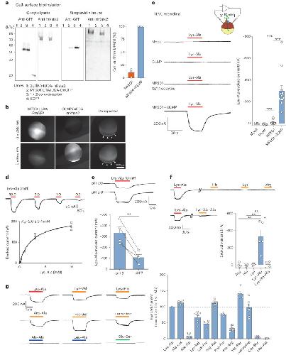 Fig. 2. Cationic dipeptides evoke an inward current in MFSD1–GLMP-expressing oocytes.a, Surface biotinylation analysis of Xenopus oocytes expressing MFSD1L11A/L12A-EmGFP and/or GLMPY400A-mKate2. The oocytes expressing EGFP in the cytosol validated the selectivity of surface labelling in streptavidin-bound fractions. The western blots are representative of three independent experiments. b, Fluorescence micrographs of representative oocytes (n = 7 for either GLMP or MDFS1 alone and n = 25 for MFSD1 + GLMP). The arrowheads show MFSD1–GLMP colocalization at the plasma membrane. c, TEVC recording of oocytes clamped at −40 mV and perfused with 10 mM Lys–Ala at pH 5.0. The traces show representative Lys–Ala-evoked currents of 7–14 oocytes per expression condition. Only 2 out of 14 oocytes expressing only MFSD1L11A/L12A-EmGFP responded to Lys–Ala. The P values were calculated using two-sided Mann–Whitney U tests (***P ≤ 0.001). d, Dose–response relationship of the Lys–Ala current in MFSD1–GLMP oocytes. The current follows Michaelis–Menten kinetics with a KM of 2.6 ± 0.4 mM (mean ± s.e.m. of n = 3 oocytes). e, Lys–Ala was applied to each MFSD1–GLMP oocyte at pH 5.0 and pH 7.0 (mean ± s.e.m. of n = 4 oocytes). Two-tailed paired t-test, **P ≤ 0.01. f, Response of MFSD1–GLMP oocytes to cationic amino acids and to the tripeptide Lys–Ala–Ala (10 mM each) at pH 5.0. The P values were calculated using two-sided Mann–Whitney U tests, *P ≤ 0.05 and **P ≤ 0.01 (mean ± s.e.m. of n = 5 oocytes (Arg, His, Lys and Lys–Ala) and n = 4 oocytes (Lys–Ala–Ala)). g, Response of MFSD1–GLMP oocytes to diverse dipeptides compared with Lys–Ala (mean ± s.e.m. of 4–11 oocytes per substrate). The source numerical data and unprocessed blots are available in the source data. |