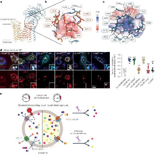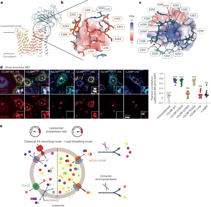 Fig. 7. Interaction of GLMP with MFSD1.a, Cartoon representation of GLMP in complex with MFSD1. The interaction site of GLMP with MFSD1 is highlighted in stick representation. b, Zoom in on the interaction of MFSD1 to GLMP as viewed from MFSD1. The electrostatic surface of GLMP is shown. Y416 (MFSD1) is in hydrogen-bond (H-bond) distance to R292 (GLMP) and is highlighted as a black dotted line. c, Zoom in on the interaction of GLMP to MFSD1 as viewed from GLMP. The electrostatic potential surface of MFSD1 is highlighted, indicating complementarity to the GLMP surface. Besides the salt bridge between residues Y416 (MFSD1) and R292 (GLMP), residue D256 (GLMP) is at an H-bond distance from the backbone amide of A261 (GLMP), shown as black dotted lines. The loop region spanning residues 253 to 260 was mutated (blue border). The single-point mutants are highlighted in bold. d, Immunofluorescence-staining of endogenous MFSD1 (red) after transfection with hemagglutinin (HA)-tagged GLMP, GLMP mutants and LAMP1 (green) in Glmp-knockout MEFs. The endogenous LAMP1 is shown in blue. The transfected cells are marked with an asterick. The Pearson correlation coefficient for MFSD1/endogenous LAMP1 is shown in the right panel. The means ± s.e.m. for n = 13–20 cells are shown over two independent experiments (two-tailed unpaired t-tests). *P ≤ 0.05, **P ≤ 0.01 and ***P ≤ 0.001. e, Cellular model for the role of MFSD1 in the recycling of amino acids (AA) derived from lysosomal proteolysis. Owing to its broad selectivity and low affinity for dipeptides, MFSD1 provides an alternative recycling route when the lysosomal breakdown of proteins exceeds the capacity of lysosomal amino acid exporters. Fast cleavage of the released dipeptides by cytosolic aminopeptidases drives MFSD1 activity in the export direction and provides amino acids for biosynthetic pathways. The narrow selectivity of MFSD1 for dipeptides (in contrast with PHT1 and PHT2 transporters) prevents competition by single amino acids and protects this load-shedding route from amino acid overload. The source numerical data are available in the source data. |
