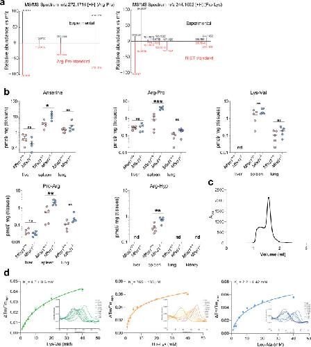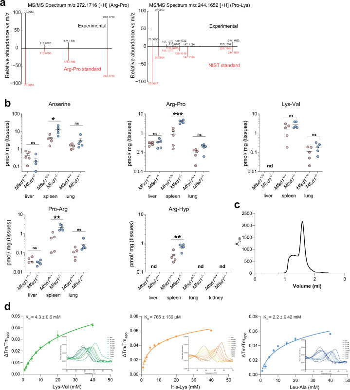 Extended Data Fig. 1. Validation of Arg-Pro and Pro-Lys with standards and dipeptide levels in tissues of Mfsd1tm1d/tm1d mice.(a) Mirror plots for the experimental MS/MS spectra of Arg-Pro (left) and Pro-Lys (right) and authentic chemical standards. The individual spectra for the experimentally determined metabolites are shown in black, and the spectra of the chemical standards are shown in red. (b) Quantification of the levels of the dipeptides anserine, Arg-Pro, Lys-Val, Pro-Arg, and Arg-Hyp in total tissue lysates of 6-month-old wildtype ad Mfsd1 knockout mice. n = 5 animals/genotype.P-values were calculated using two-tailed paired t-tests. Error bars show the mean ± SEM. (c) SEC chromatogram of purified MFSD1 with a Streptavidin-tag (Superdex 200 5/150 increase (Cytiva) column). (d) KD measurements for Lys-Val, His-Lys, Leu−Ala. KD measurements are based on changes in the thermal stability of MFSD1 in the presence of varying concentrations of the dipeptides Lys-Val (green), His-Lys (orange), and Leu−Ala (blue). N = 3 experiments, data are shown as mean ± SEM. KD values were determined using Moltenprot (Kotov et al.67). Source numerical data are available in source data. |