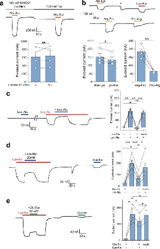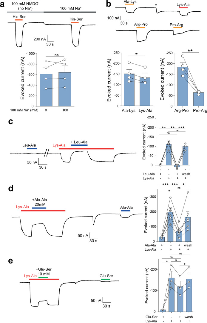 Extended Data Fig. 2. Dipeptide selectivity of MFSD1/GLMP in the TEVC oocyte assay.(a) The MFSD1/GLMP transport current does not depend on sodium ions. His-Ser (10 mM) was applied to MFSD1/GLMP oocytes at pH 5.0 in the presence of Na+ or NMDG+ as the major cation. P-values were calculated using two-tailed paired t-tests. mean + SEM, n = 4 oocytes. (b) Residue order effect for two cationic dipeptides. Representative traces and mean TEVC currents ± SEM of four MFSD1/GLMP oocytes. P-values were calculated using two-tailed paired t-tests. mean ± SEM, n = 4 oocytes. (c, d) Competition of the Lys-Ala current by neutral dipeptides. Lys-Ala (3 mM) and Leu-Ala or Ala-Ala (20 mM) were applied separately or simultaneously to MFSD1/GLMP oocytes at pH 5.0. Representative traces and mean currents ± SEM n = 4 (Leu-Ala) n = 6 (Ala-Ala) oocytes. (e) The competition experiment was repeated with the anionic dipeptide Glu-Ser (10 mM). P-values were calculated using two-tailed paired t-tests, mean ± SEM, n = 3 oocytes. Source numerical data are available in source data. |