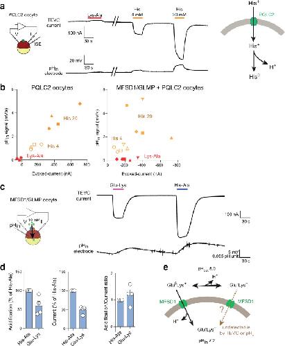 Extended Data Fig. 3. Additional evidence for the uniporter model uptake of Glu-Lys into MFSD1/GLMP oocytes.(a) Combined TEVC and intracellular pH (pHin) recording of oocytes expressing only the sorting mutant of PQLC2. Lys-Ala (20 mM) is not transported by PQLC2. The traces are representative of four PQLC2 oocytes. (b) The current/acidification relationship of the experiments is shown in Fig. 4a and Extended Data Fig. 3a. The graphs show individual TEVC and pHin responses to Lys-Ala (10 mM) and His (4 or 20 mM). Each symbol shape represents a distinct oocyte. (c) Representative TEVC and pHin traces of the response of MFSD1/GLMP oocytes to Lys-Glu. (d) Acidification and current responses normalized to His-Ala and normalized acidification/current ratios. Data are means ± SEM of 4 oocytes. (e) A model accounting for the uptake of Glu-Lys by MFSD1/GLMP. Only uptake of the minor cationic form, Glu0-Lys+, can be detected in this electrophysiological technique. Source numerical data are available in source data. |