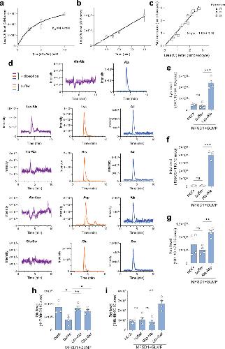 Extended Data Fig. 4. Additional evidence for Leu-Ala uptake by MFSD1 and Substrate selectivity of MFSD1/GLMP in the LC-MS/MS assay.(a) Dose-response relationship of the accumulation of Leu(d3) in MFSD1/GLMP oocytes exposed to Leu(d3)-Ala (means ± SEM of 3 oocytes). The line shows a hyperbolic curve fit with a KM value of 4.4 mM (R2 = 0.989). (b) Time course of Leu(d3) accumulation in the presence of 10 mM Leu(d3)-Ala (means ± SEM of 3 oocytes). Linear regression R2 = 0.980. (c) Relationship between the accumulation of Leu(d3) and the increase of ‘light’ Ala over its endogenous level. Data shown in Fig. 5c were replotted to show the equimolar ratio between these two proxies of Leu(d3)-Ala uptake. Linear regression of the pooled data yielded a ratio of 1.15 Ala molecule co-released with each Leu(d3) molecule (R2 = 0.980), or a mean ratio of 1.09 ± 0.09 when the 3 experiments were analyzed separately. (d-i) Substrate selectivity of MFSD1/GLMP in the LC-MS/MS assay. (d) Representative LC-MS chromatograms of 6 to 8 oocytes per condition from 2 independent experiments. (e-i) Relative quantification of the chromatographic peak area of Lys, His, Asp, Glu, and Ser in extracts from mock and MFSD1/GLMP oocytes, incubated or not, with the indicated dipeptides (10 mM) for 23 min at pH 5.0. Data are means ± SEM; (e + g): n = 4 oocytes, (f): n = 3 oocytes from the same experiment. Two-tailed unpaired t-tests: ns = not significant; * p ≤ 0.05; ** ≤ 0.01; *** p ≤ 0.001. Source numerical data are available in source data. |