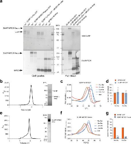 Extended Data Fig. 5. The recombinantly expressed proteins interact in vitro.(a) Pull-down assays of Twin-Strepavidin (strep) tagged MFSD1 (MFSD1-Nt-strep), GFP-strep-tagged GLMP-MFSD1 (GLMP-MFSD1-Nt-strep-GFP) and GFP-8×His-tagged GLMP (GLMP-Ct-His-GFP) and GLMP-MFSD1-Nt-strep-GFP. Each protein was individually over-expressed in Expi293F, and additionally, MFSD1-Nt-strep was co-expressed with GLMP-Ct-His-GFP. MFSD1 and GLMP were detected in Western blot using specific primary antibodies against either MFSD1 or GLMP. Samples either contained crude lysate (lys) or the soluble fraction (sol) of each construct over-expressed in Expi293F cells (left panel) or the elution fraction after pull-down over Strep-Tactin beads (right panel). Bands corresponding to GLMP, GLMP-MFSD1, or MFSD1 are indicated. The experiment was performed once. (b) SEC chromatogram and SDS-PAGE gel of purified GLMP in complex with MFSD1 carrying a twin-streptavidin-tag (MFSD1-strep). (c) Thermal stability of GLMP in complex with MFSD1-strep in the absence (apo) or presence of 5 mM His-Ser, His-Ala, Lys-Val, or Leu-Ala. (d) Normalized initial uptake rates of the dipeptides His-Ala or His-Ser during liposome-based assays by MFSD1WT and GLMP/MFSD1 complex. n = 4, of two reconstitution batches; Error bars are shown as SD. (e) SEC chromatogram and SDS-PAGE gel of purified GLMP-MFSD1-fusion protein carrying a twin-streptavidin-tag. (f) Thermal stability of GLMP-MFSD1-fusion protein in the absence (apo) or presence of 5 mM His-Ser, His-Ala, Lys-Val, or Leu-Ala. (g) Normalized initial uptake rates of the dipeptides His-Ala or His-Ser during liposome-based assays by MFSD1WT and GLMP-MFSD1 fusion protein. n = 4, Error bars are shown as SD. Source numerical data and unprocessed blots are available in source data.