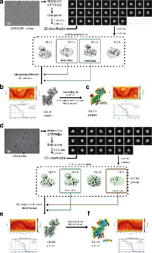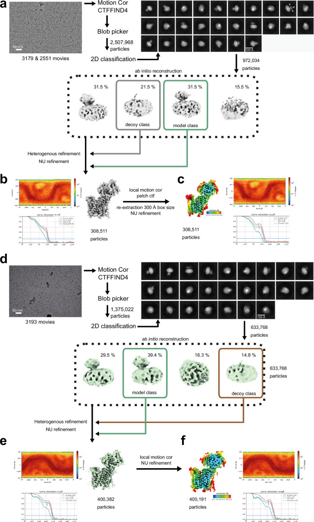 Extended Data Fig. 6. Cryo-EM data collection and processing of the GLMP-MFSD1apo and GLMP-MFSD1His-Ala data sets.(a) Image data processing workflow with a representative micrograph and 2D classes of the GLMP-MFSD1apo data set. All data were processed in cryoSPARC. (b) Angular distribution plot, GSFSC plot, and cryoEM map of initial reconstruction before further refinement. White arrowheads denote densities corresponding to N-glycans. (c) Angular distribution plot, GSFSC plot, and cryo-EM map of the final GLMP-MFSD1apo reconstruction colored by local resolution. (d-f) Cryo-EM data collection and processing of the GLMP-MFSD1His-Ala data set. (d) Image data processing workflow with a representative micrograph and 2D classes of the GLMP-MFSD1His-Ala data set. All data were processed in cryoSPARC. (e) Angular distribution plot, GSFSC plot, and Cryo-EM map of initial reconstruction before further refinement. White arrowheads in 2D class references denote densities corresponding to N-glycans. (f) Angular distribution plot, GSFSC plot, and Cryo-EM map of the final GLMP-MFSD1His-Ala reconstruction colored by the local resolution. |