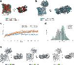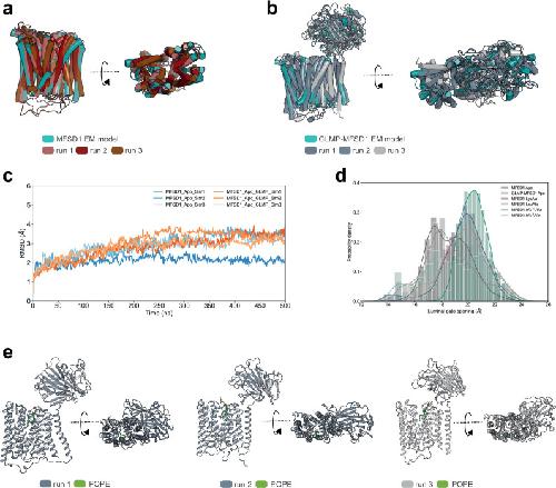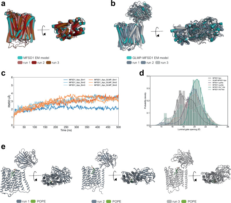 Extended Data Fig. 9. Analysis of MD simulations of GLMP-MFSD1apo and MFSD1apo.(a) Superposition of MFSD1 starting model (in blue, derived from the cryoEM model) and the structure after 500 ns of MD simulations of the three replicates (shades of red). (b) Superposition of GLMP-MFSD1 starting models (in blue, representing the cryoEM structure) and the complex after 500 ns of MD simulations of the three replicates (shades of grey). (c) RMSD (MFSD1 in relation to the starting CryoEM model) changes over the course of the MD simulation. The change in RMSD of MFSD1 in the apo form is shown in red, and the RMSD change of MFSD1 in the apo form as part of the complex with GLMP is given in grey blue. Each model was run in triplicates (Sim 1-3). (d) Conformational dynamics of the gate open to the lysosomal lumen (luminal gate) of MFSD1 in the absence/presence of the substrates and GLMP+MFSD1apo. The width of the opening of the luminal gate is defined as the distance between the centre of mass of two TM groups (group 1: TM1, TM2, and TM5; group 2: TM7, TM8, and TM11) and is plotted against its probability density. (e) A POPE lipid molecule (green) is only found between TMs of MFSD1 during simulations (run1-3) of the GLMP-MFSD1apo complex but not when simulations are run on MFSD1 only. |