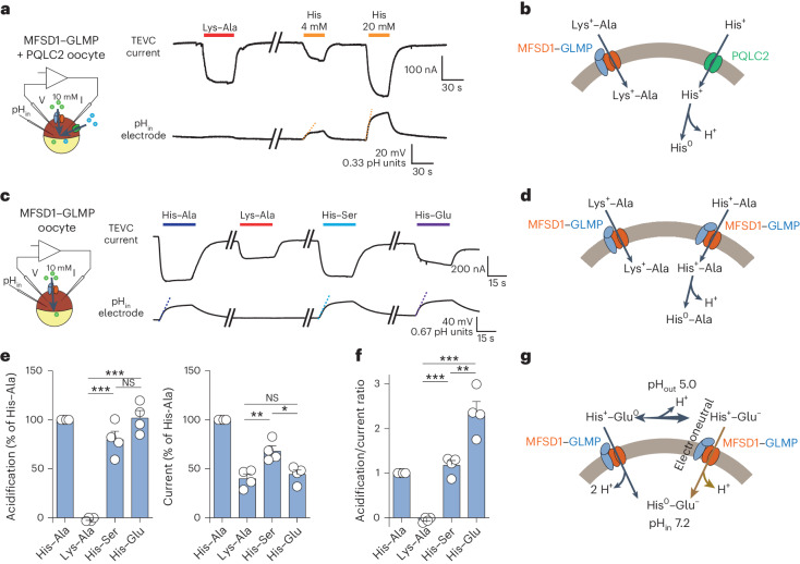 Fig. 4. MFSD1 is a dipeptide uniporter.a, Combined TEVC and pHin recording of oocytes expressing both MFSD1–GLMP and PQLC2 (sorting mutant L290A/L291A) at their surface. His, but not Lys–Ala, applied at pH 5.0, induces intracellular acidification (orange dotted lines). The traces are representative of five oocytes shown in Extended Data Fig. 3b. b, A model for the acidification induced by His following its release from PQLC2. c, Combined TEVC and pHin recording of an MFSD1–GLMP oocyte perfused with the indicated dipeptides (10 mM) at pH 5.0. d, A model accounting for the selective acidification by His-containing dipeptides. e, The experiment in c was repeated on four MFSD1–GLMP oocytes. The data are means ± s.e.m. of the acidification and current responses normalized to His–Ala (two-tailed unpaired t-test). *P ≤ 0.05, **P ≤ 0.01 and ***P ≤ 0.001. f, Normalized acidification/current ratios provide the number of protons released per translocated elementary charge for each substrate (two-tailed unpaired t-test). Mean ± s.e.m. **P ≤ 0.01 and ***P ≤ 0.001. g, A model accounting for the high number of protons released by His–Glu. At the tested potential (−40 mV), His–Glu molecules would be taken up by MFSD1–GLMP predominantly in the minor cationic form, His+–Glu0, releasing two protons per elementary charge. The higher acidification/current ratio observed (2.5 ± 0.2) may result either from the non-linear acidification/current relationship (Main) or from simultaneous uptake in the predominant zwitterionic form, His+–Glu-, which would release another proton in an electroneutral manner. The source numerical data are available in the source data.Source data |
