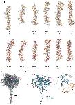 Extended Data Fig. 8. MD simulations of dipeptide-bound MFSD1 and Flexibility of dipeptide binding in MFSD1 during MD simulations.(a) MD simulations were performed on MFSD1 in complex with the dipeptides Leu-Ala (rose), His-Ala in its neutral (His(0)-Ala, pale teal) and charged (His(+)-Ala, teal) state and Lys(+)-Ala, purple). The basis of the binding mode for each peptide was the initial non-protein density found in the GLMP-MFSD1His-Ala map. The dipeptide His-Ala was placed in two different binding poses, denoted peptide orientation 1 (pale blue background) and peptide orientation 2 (light orange background). Based on this pose, the remaining ligands were oriented. Shown and labeled are critical binding site residues for each starting structure and the same view for the binding site of each simulation run after 500 ns. Additional interacting residues appearing at the endpoint of the simulation are highlighted in the respective panels. (b-g) Flexibility of dipeptide binding in MFSD1 during MD simulations. (b) The binding site of MFSD1 represents the starting pose of Leu-Ala (grey) and the final pose of the peptide after 500 ns of MD simulation (light purple) for each of the two peptide orientations (1 and 2). Below are RMSD plots of distant changes of the N- and C-terminus of the peptide with respect to residues E150 and R181. Plots show the results for each peptide orientation (orientation 1-blue, orientation 2-orange). MD simulations were run in triplicates. (c) Illustration of the MFSD1 binding site of MFSD1 with the starting pose of Lys-Ala pose of the dipeptide His(0)-Ala (grey) and the final pose after 500 ns of triplicate MD simulation (pale teal) for each of the two peptide orientations (1&2). (d) Binding site of MFSD1 showing the starting pose of the dipeptide His(0)-Ala (grey) and the final pose after 500 ns of MD simulation (pale teal) for each of the two peptide orientations (1&2). Below are RMSD plots of distant changes of the N- and C-terminus of the substrate with respect to residues E150 and R181. RMSD plots highlight the results for each peptide orientation (orientation 1-blue, orientation 2-orange) run in triplicates. (e) The Starting pose of the dipeptide His(+)-Ala (grey) and the final pose in the MFSD1 binding site after 500 ns of MD simulation (dark teal) are shown for each of the two peptide orientations (1&2). MD simulations were run in triplicates for each peptide orientation (orientation 1-blue, orientation 2-orange). (f) Comparison of dipeptide binding sites of MFSD1 in the outward-open conformation (orange) either in complex with Leu-Ala (MD simulation run 3, peptide orientation 2) or His(+)-Ala (MD simulation run 1, peptide orientation 2), the Cryo-EM structure of PepT1 (PDB-ID: 7PMX) in the outward-open conformation (pale purple) in complex with Ala-Phe, and the X-ray structure of DtpB (PDB-ID: 8B1H) in the inward-open conformation (pale green) bound to the dipeptide Lys-Val. Critical residues important for the coordinating of the N-terminus of the substrate are framed in blue and the C-terminus in red. Hydrogen bonds are shown as black dashed lines. (g) Plots of the distance changes between the N- (LigNter), C-terminus (LigCter), and the sidechain of the 2nd amino acid (LigSC2) in the ligand and sixteen residues located in the MFSD1 binding site. |