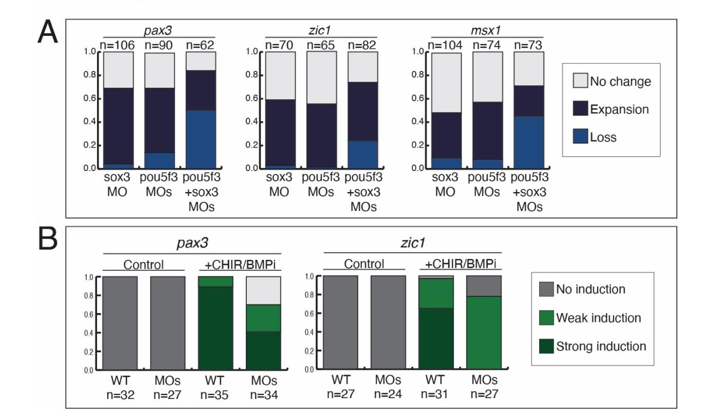 SoxB1 transcription factors (Sox2/3) are well known for their role in early neural fate specification in the embryo, but little is known about functional roles for SoxB1 factors in non-neural ectodermal cell types, such as the neural plate border (NPB). Using Xenopus laevis, we set out to determine if SoxB1 transcription factors have a regulatory function in NPB formation. Herein, we show that SoxB1 factors are necessary for NPB formation, and that prolonged SoxB1 factor activity blocks the transition from a NPB to a neural crest state. Using ChIP-seq we demonstrate that Sox3 is enriched upstream of NPB genes in early NPB cells and in blastula stem cells. Depletion of SoxB1 factors in blastula stem cells results in downregulation of NPB genes. Finally, we identify Pou5f3 factors as potential Sox3 partners in regulating the formation of the NPB and show their combined activity is needed for normal NPB gene expression. Together, these data identify a novel role for SoxB1 factors in the establishment and maintenance of the NPB, in part through partnership with Pou5f3 factors.