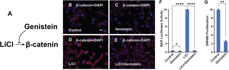 (A-F) Genistein blocks activation of the Wnt pathway by LiCl and inhibits β-catenin stabilization in HEK 293 cells