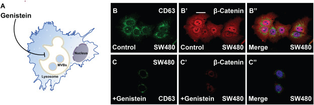 (C–C″) Cells with identical treatment as (B)-(B″) after the overnight genistein treatment (250 μM). Genistein treatment reduces both CD63 and