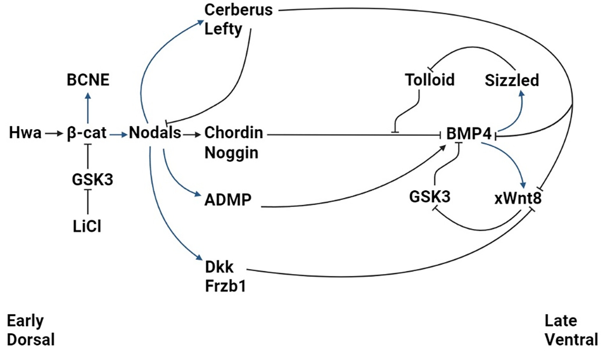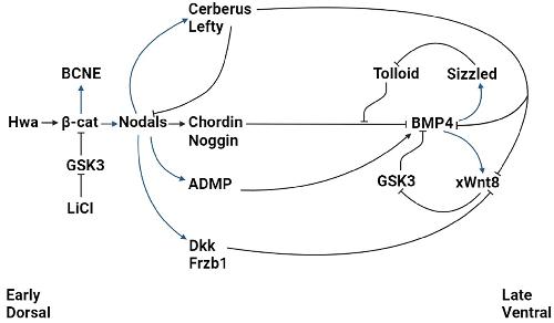 Proposed molecular pathway for self-organizing axial development in Xenopus embryos. Black activator or inhibitory arrows indicate interactions at the protein level and blue arrows show that transcriptional activation steps. Hwa is an egg maternal mRNA that stabilizes the β-catenin transcriptional activator by increasing Axin1 degradation (14). Dorsal β-catenin promotes high Nodal signaling levels from the Nieuwkoop center in endoderm at early blastula, as well as the BCNE (Blastula Chordin and Noggin Expression center) in dorsal ectoderm (43). The BCNE expresses Siamois, a homeobox protein that plays an important role in the induction of Spemann organizer genes but is not indicated in this diagram (44). Expression of Xenopus Nodal-related genes is required for the induction of secondary axes by Hwa. At the gastrula stage, the Spemann–Mangold organizer center secretes a cocktail of proteins such as the BMP antagonists Noggin and Chordin, the Wnt antagonists Dkk1 and Frzb-1, ADMP, and the multivalent inhibitors Lefty (antagonist of Nodals and activing) and Cerberus (antagonist of Nodal, BMP, and Wnt). At the opposite pole of the embryo, the ventral center has high BMP4/7 signals that oppose the influence of the organizer. xWnt8 is induced by BMP and, in a positive feedback loop, increases BMP signaling through GSK3 inhibition. Sizzled is an inhibitor of the Tolloid proteinase that degrades Chordin, which is transcribed at high levels of BMP, forming a negative feedback loop that increases Chordin levels when BMP is high. Dkk1 and Frzb-1 inhibit the activity of xWnt8 at late gastrula, reducing BMP signaling. |
