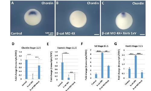 Siamois in 4 x β-cat MO injected embryos in qRT-PCR assays. (F and G) The ventral genes