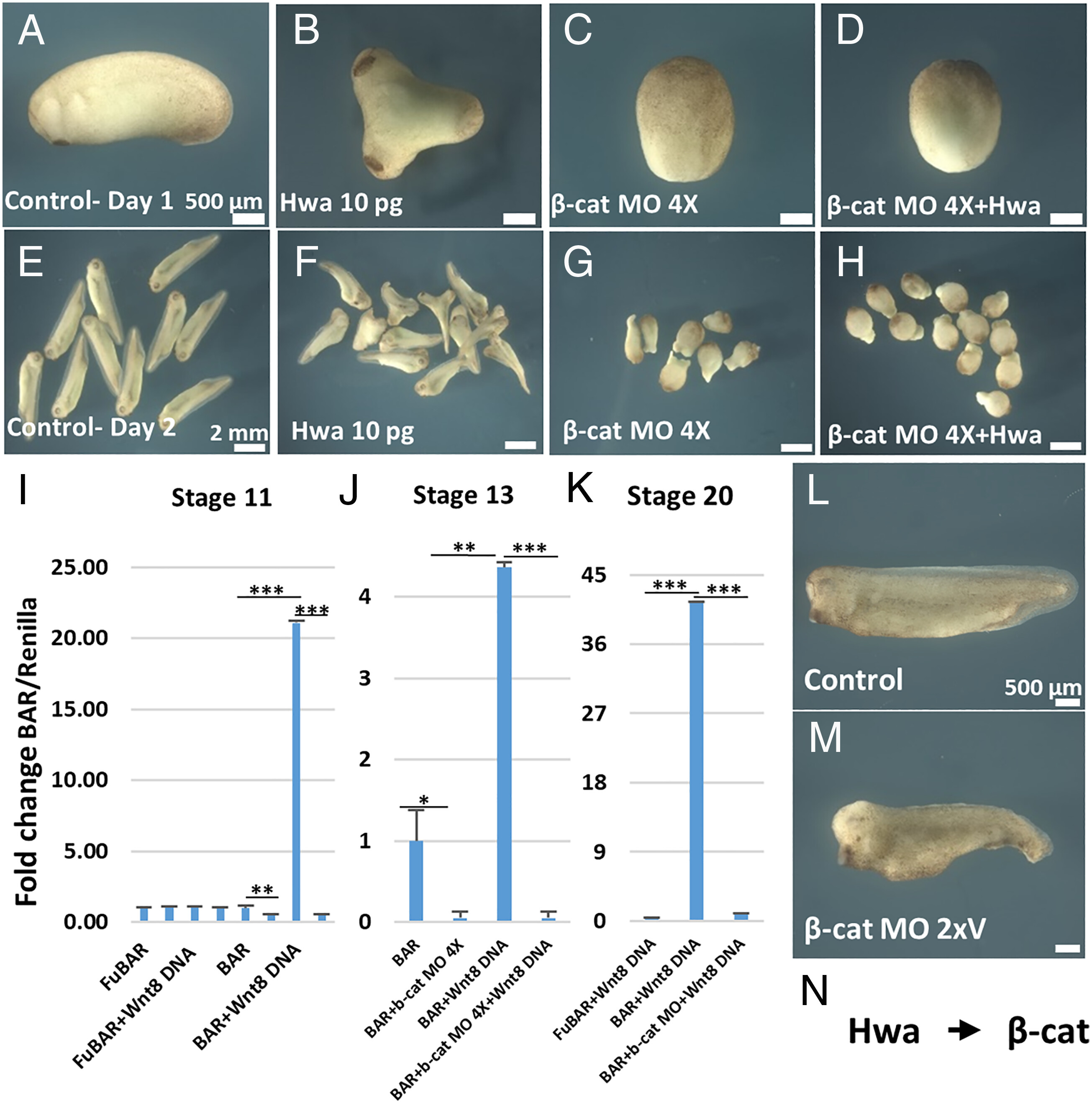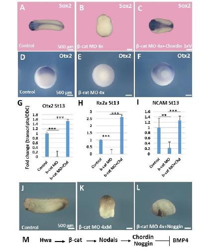dorsalization. Scale bars: 500 µm. (M) Diagram for Hwa/β-catenin/Nodal/Chordin/BMP4