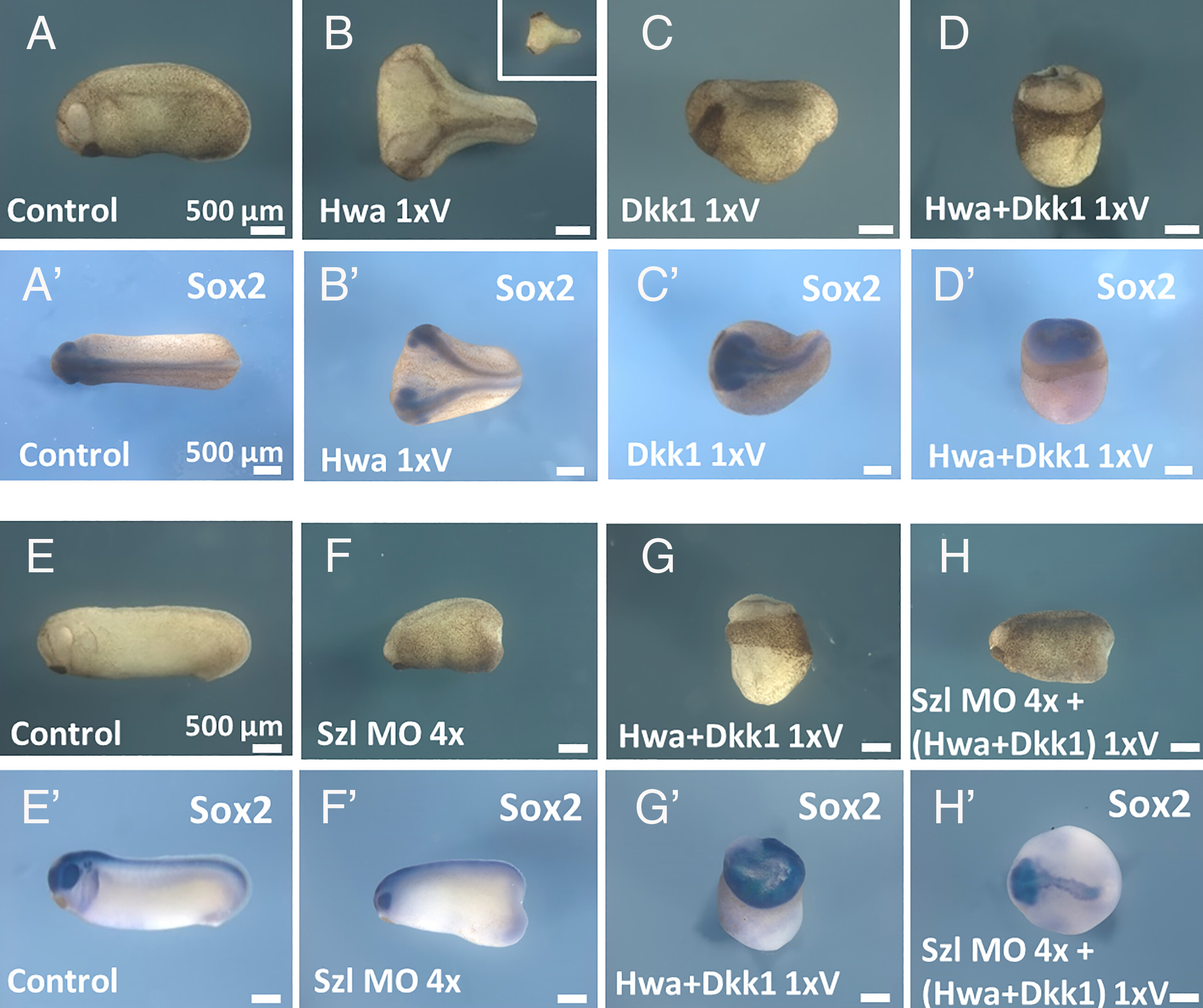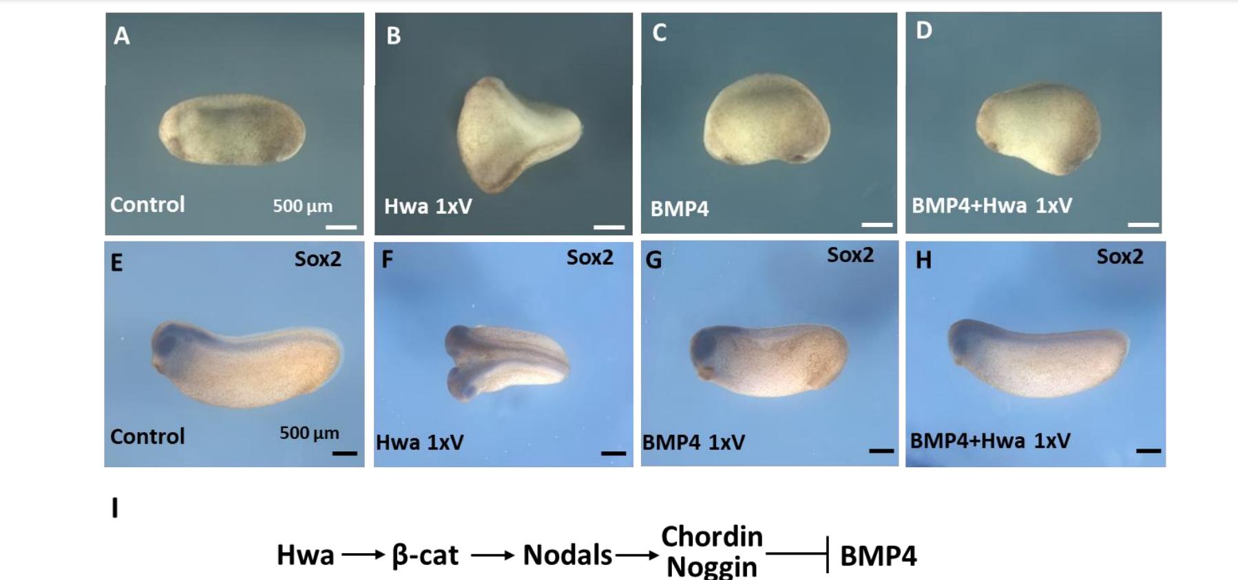 Hwa axis. (E-H) In situ hybridizations of Sox2 for control, Hwa, xBMP4 and coinjection