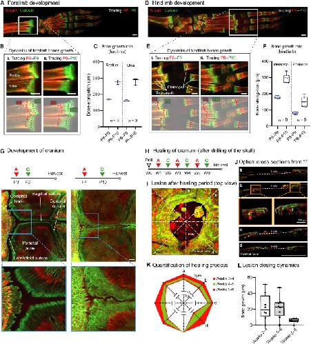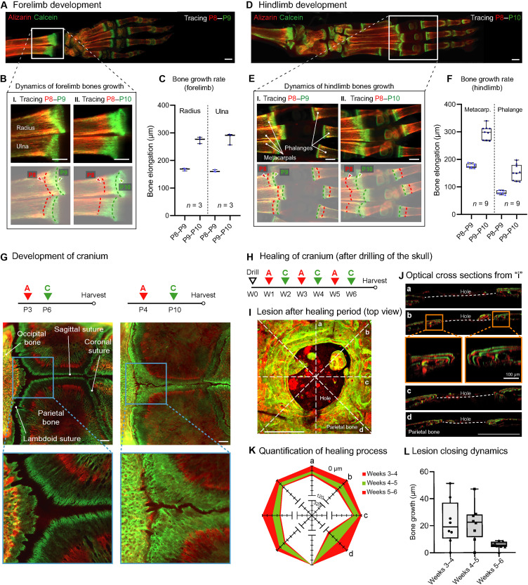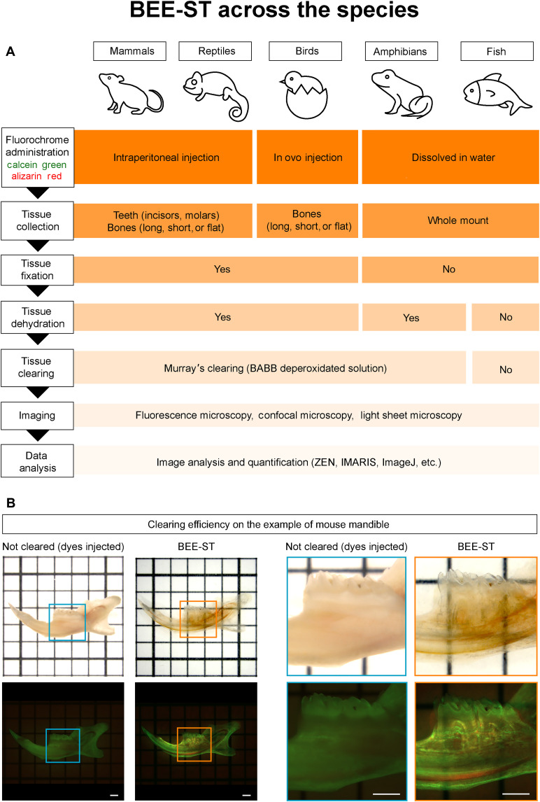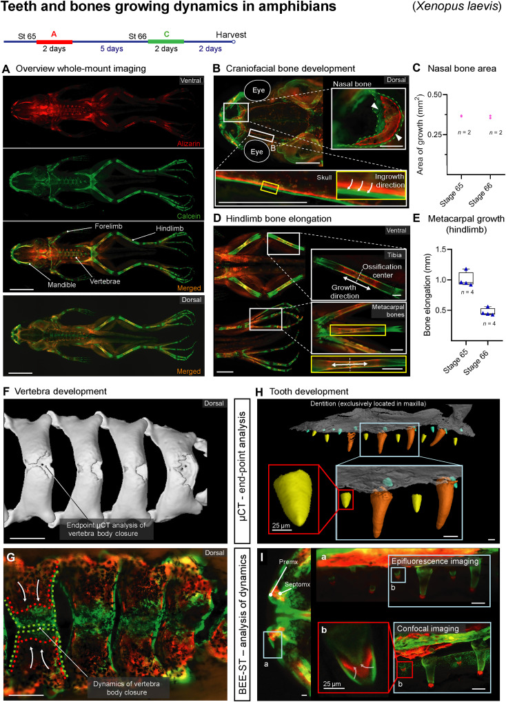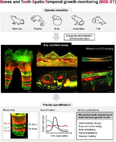 Mineralized tissues, such as bones or teeth, are essential structures of all vertebrates. They enable rapid movement, protection, and food processing, in addition to providing physiological functions. Although the development, regeneration, and pathogenesis of teeth and bones have been intensely studied, there is currently no tool to accurately follow the dynamics of growth and healing of these vital tissues in space and time. Here, we present the BEE-ST (Bones and tEEth Spatio-Temporal growth monitoring) approach, which allows precise quantification of development, regeneration, remodeling, and healing in any type of calcified tissue across different species. Using mouse teeth as model the turnover rate of continuously growing incisors was quantified, and role of hard/soft diet on molar root growth was shown. Furthermore, the dynamics of bones and teeth growth in lizards, frogs, birds, and zebrafish was uncovered. This approach represents an effective, highly reproducible, and versatile tool that opens up diverse possibilities in developmental biology, bone and tooth healing, tissue engineering, and disease modeling.