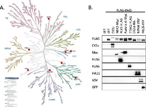 Fig. 2. Validation of the panel of DVL3 kinases. a: Visualization of the kinases used in this study in the phylogenetic kinome tree (http://www.kinhub.org/kinmap/). The individual kinases are representatives of distant kinase groups except for CK1ε and TTBK2 that are members of CK1 superfamily. b. HEK293 cells were transfected by plasmids encoding FLAG-DVL3 and the indicated kinase. Ability of individual kinases to promote DVL3 phosphorylation detected as the electrophoretic mobility shift on WB was assayed. Alpha-tubulin was used as a loading control