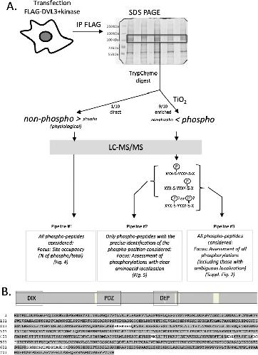 Fig. 3. Experimental design. a: FLAG-DVL3 was overexpressed (with or without kinase) in HEK293 cells. After cell lysis DVL3 was immunoprecipitated using anti-FLAG antibody. Immunoprecipitates were separated on SDS-PAGE gel electrophoresis, stained with Coomassie brilliant blue and the 1D bands corresponding to DVL3 were excised, digested with trypsin and subsequently cleaved by chymotrypsin. In the pipeline #1, the aliquot (1/10) of concentrated sample was directly analyzed by LC-MS/MS in order to analyze site occupancy of the abundant phosphorylated sites. The rest of the sample was enriched for phosphorylated peptides using TiO2 and analyzed by LC-MS/MS to obtain detailed information of DVL3 phosphorylation status. Data from LC-MS/MS were searched, manually validated in Skyline software and further processed by two approaches. In the first approach (pipeline #2) only phosphorylated peptides with the clearly localized phosphorylated site (based on manual inspection of spectra) were considered. In the second approach (pipeline #3) we have considered all phosphorylated peptides that in some cases resulted in the formation of “clusters” of phosphorylated sites. b: The overall sequence coverage of DVL3 across all kinases and replicates. Regions of DVL3 covered by the peptides detected (Mascot score > 20) in any of the MS/MS analyses are highlighted in grey. For sequence coverage in individual samples see Additional file 6: Table S2