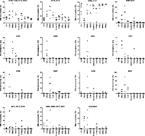 Fig. 4. Site occupancy of the abundant phosphorylated sites. Site occupancy analysis was performed according to the pipeline #1 in Fig. 3a. Fifteen phosphorylated peptides or clusters that were phosphorylated in more than 5% at least in one replicate are plotted. Graphs present individual data points from three biological replicates (two controls/biological sample) and the mean values (horizontal line)