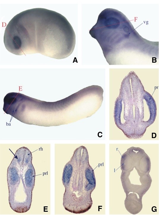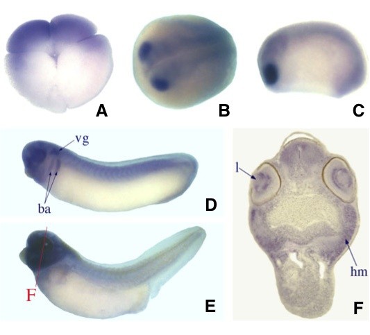 Using RT-PCR and in situ hybridisation, we have analysed the temporal and spatial expression patterns of Xenopus Fox genes of subclass N. By screening cDNA libraries and by RT-PCR using embryonic RNA and primers derived from EST analyses, we could isolate FoxN2, FoxN4, FoxN5 and different isoforms of FoxN3. FoxN2 and FoxN3 transcripts were found during all developmental stages including early cleavage and tailbud stages. FoxN5 transcripts were only present at early cleavage stages, while FoxN4 expression began after midblastula transition. Spatial expression of FoxN2 was first detected in the early eye field and later, in the branchial arches, the vagal ganglion and in the developing retina. FoxN3 transcripts were found within the animal cap. In post-gastrula embryos, neural crest cells and the early eye field showed strong expression of FoxN3. At late tadpole stages, the branchial arches were stained. FoxN4 was expressed in the early eye field and later in the developing retina cells, the nephrostomes of the pronephric kidney and in the midbrain. A ubiquitous expression of FoxN5 was found in early cleavage stage embryos.