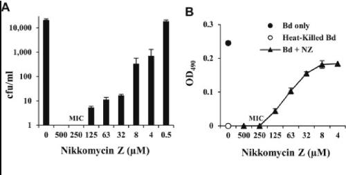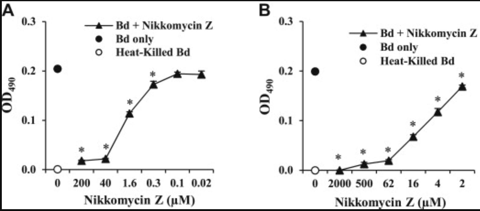 Fig 1. Coculture with nikkomycin Z impaired B. dendrobatidis (Bd) growth in vitro. (A) B. dendrobatidis was cultured in equal parts tryptone broth and HPLC water (‘Bd only’) or in equal parts tryptone broth with various concentrations of nikkomycin Z in HPLC water ranging from 0.02 to 200 μM (‘Bd + Nikkomycin Z’). Concentrations ≥ 0.3 μM nikkomycin Z showed significantly lower growth than the positive control (*p < 0.01). (B) At 2000 μM nikkomycin Z, B. dendrobatidis growth is not significantly different (p > 0.2) from the heat-killed B. dendrobatidis negative control. Data shown are representative of at least three similar experiments. |