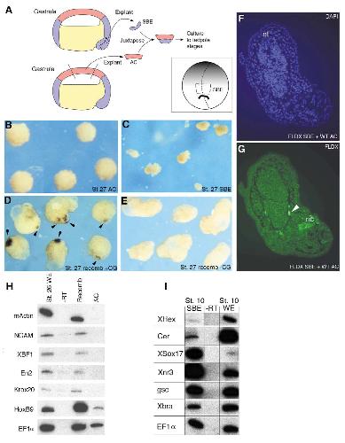 embryos (H) develop normal anterior structures including cement glands and eyes. (93%, 179 explants in total from six experiments.) An RTCR assay (I)