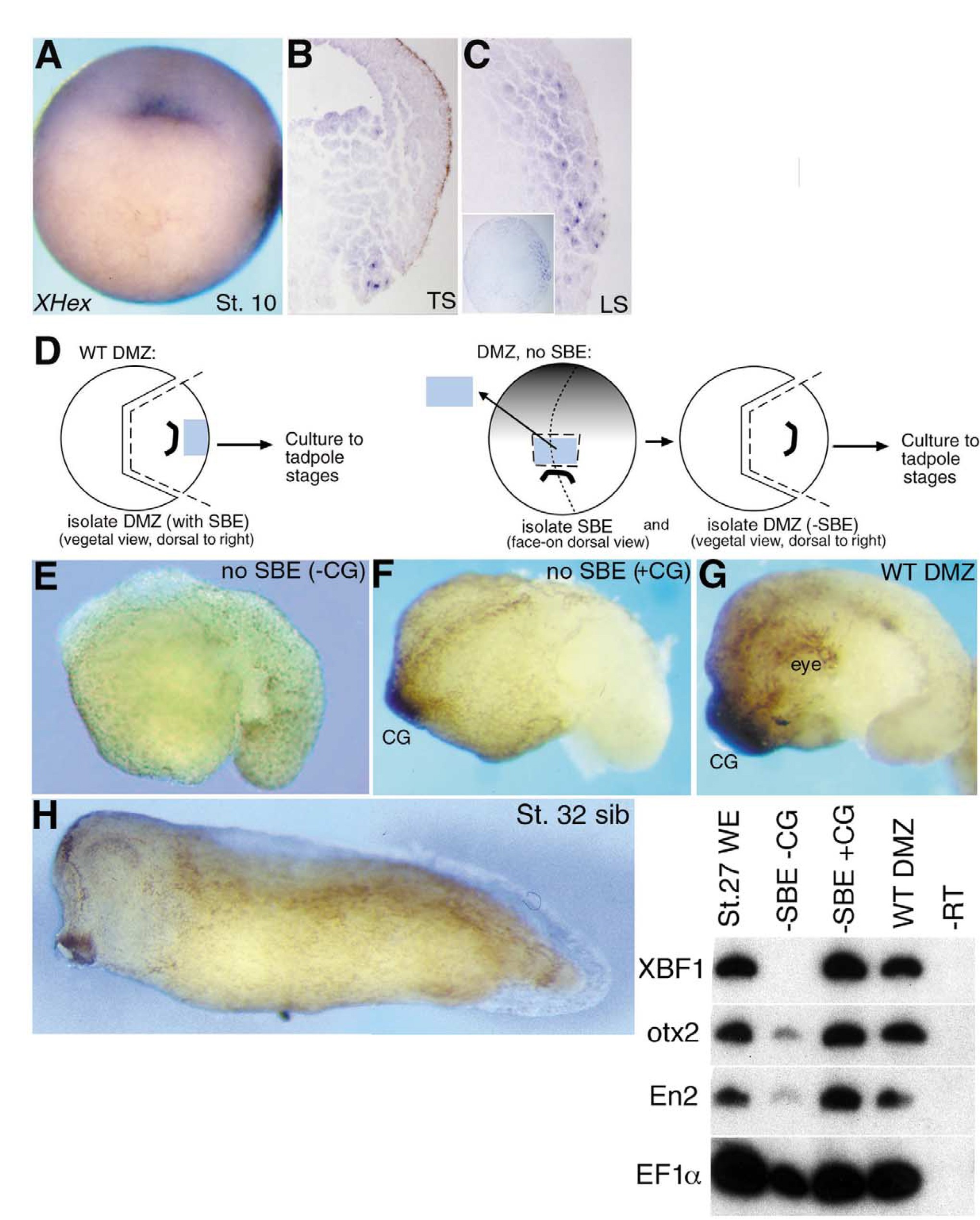 culture assay (D) was used to investigate the importance of the Xhex-expressing SBE for head organiser formation. Half of the DMZs with the SBE removed