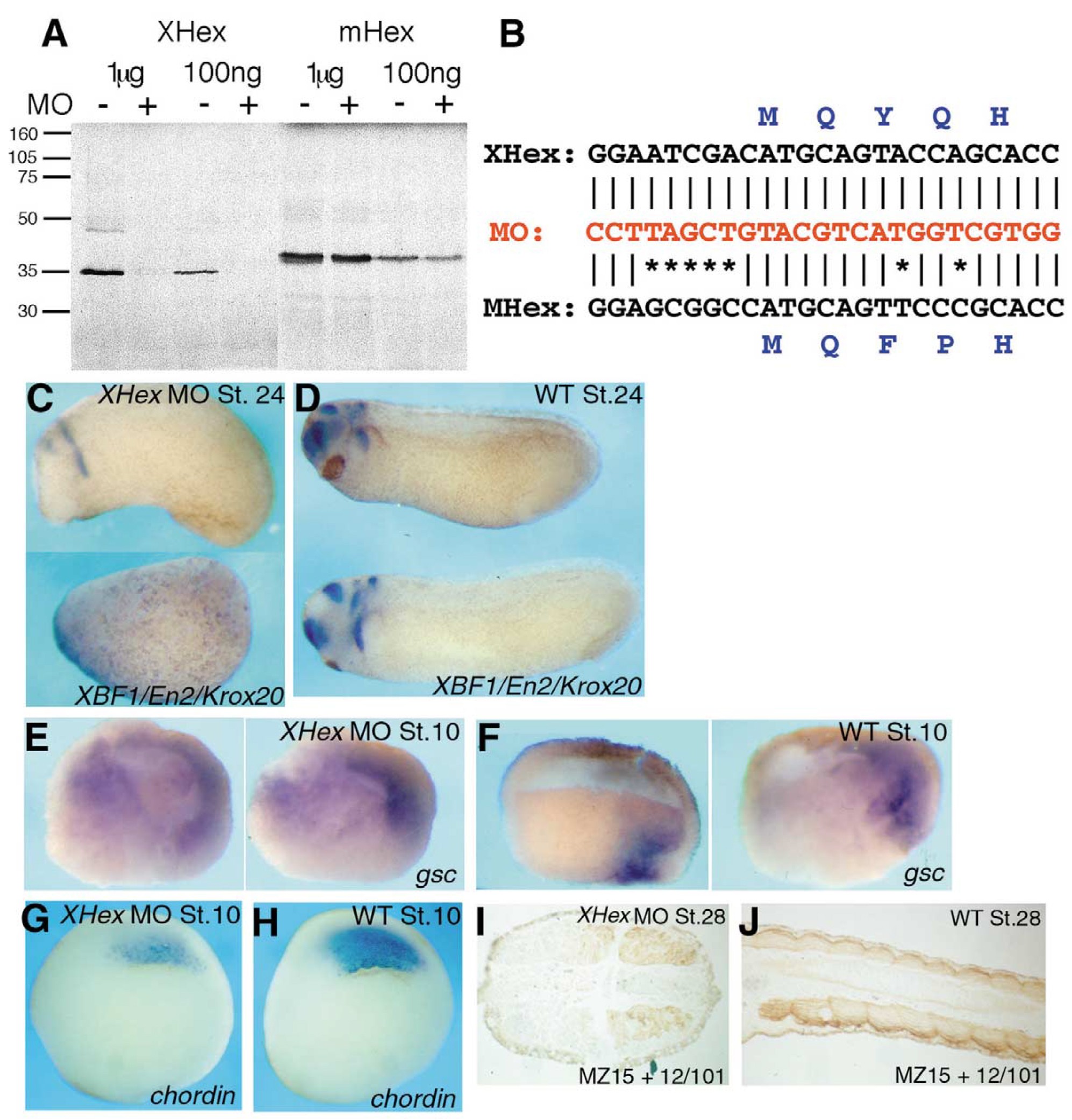Fig. 3. Knockdown of Xhex function perturbs the organiser and causes loss of anterior structures. In vitro translation assay (A) shows that Xhex antisense