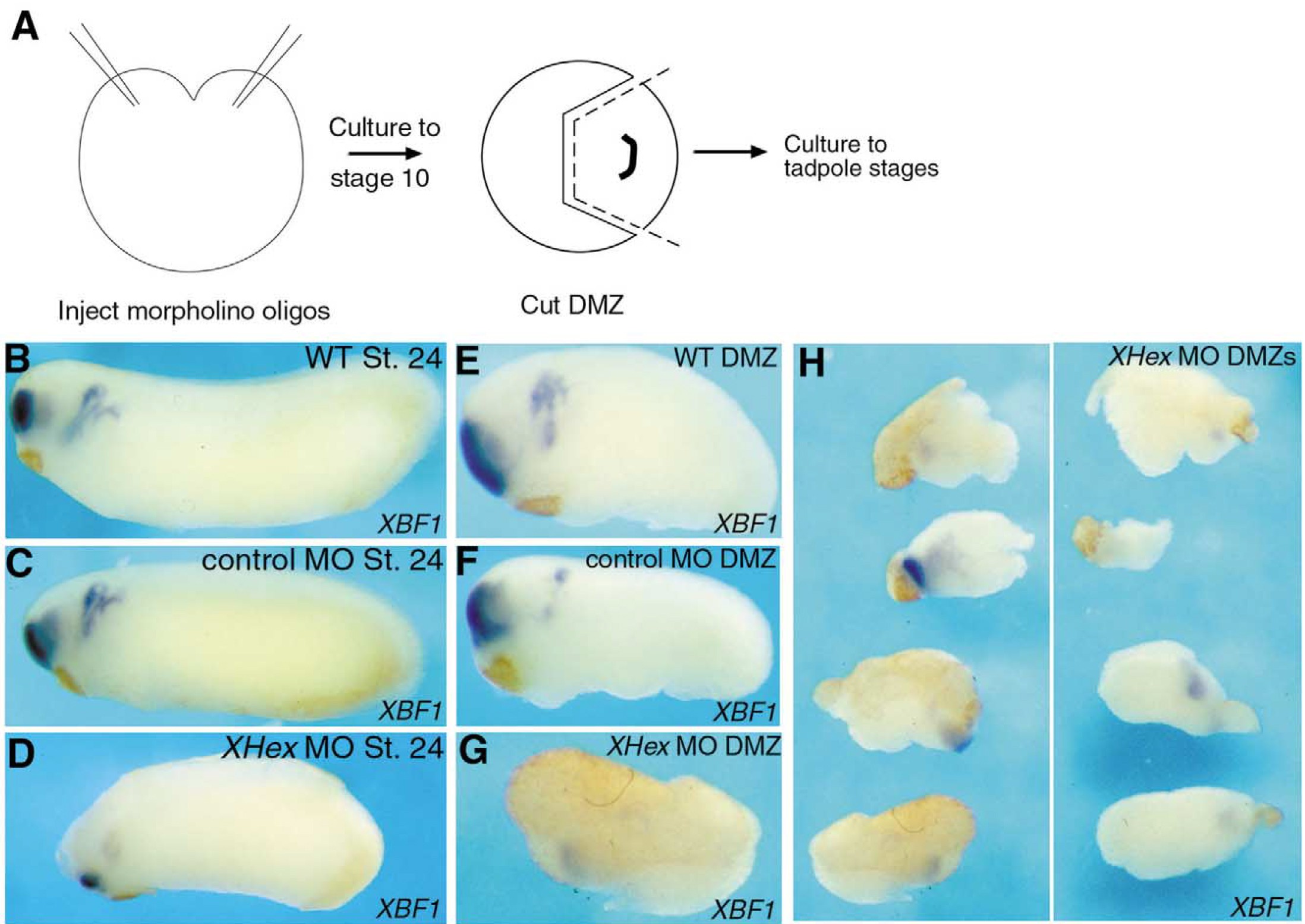 cultured to tadpole stages (A). Uninjected siblings (B) and control MO injected embryos (C) show a wild-type XBF1 expression pattern, while Xhex MOinjected