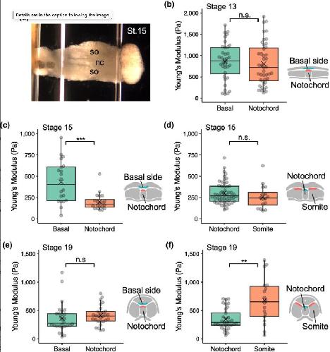 Elasticity of neural and mesodermal explants. (a) Representative atomic force microscopy image of mesodermal explant at stage 15. Anterior is to the left. nc, notochord; so, somites. (b, c, e) Stiffness of the basal surface of the neural plate and notochord at stages 13 (b), 15 (c), and 19 (e); n = 36 indentations, 4 embryos (stage 13, basal); 43 indentations, 5 embryos (stage 13, notochord); 20 indentations, 8 embryos (stage 15, basal); 20 indentations, 8 embryos (stage 15, notochord); 28 indentations, 5 embryos (stage 19, basal); 29 indentations, 4 embryos (stage 19, notochord). The basal surface of the neural plate (green) was softer than the notochord (orange) at stage 15 (p = 3.3 × 10−4) but not at stages 13 (p = .47) and 19 (p = .14). (d, f) Stiffness of the notochord and somite at stages 15 (d) and 19 (f); n = 54 indentations, 25 embryos (stage 15, notochord); 16 indentations, 11 embryos (stage 15, somite); 33 indentations, 5 embryos (stage 19, notochord); and 29 indentations, 4 embryos (stage 19, somite). The notochord (green) was softer than the somite (orange) at stage 19 (p = 1.3 × 10−3) but not at stage 15 (p = .19). The box and whiskers indicate the maximum, third quartile, median, first quartile, and minimum values of each group; data beyond the end of the whiskers (the upper limit of whiskers is 1.5 times the box length) are shown as outliers; a cross mark indicates the mean value. p-values were calculated using the two-sided Wilcoxon rank-sum test (**p < .01; ***p < .001; n.s., not significant). |