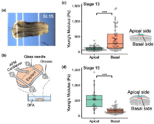 FIGURE 2. Elasticity of neural plate explants. (a, b) A representative image (a) and schematic (b) of atomic force microscopy (AFM) measurement. Anterior is to the left. An excised neural plate explant is fixed on a plastic dish using pieces of thinly pulled glass capillaries and silicon grease. The explant surface (orange) is indented using a bead‐attached AFM cantilever. The dashed line indicates the midline. (c, d) Stiffness of the apical and basal surfaces of the neural plate at stages 13 (c) and 15 (d); n = 49 indentations, 4 embryos (stage 13, apical); 54 indentations, 5 embryos (stage 13, basal); 20 indentations, 7 embryos (stage 15, apical); 55 indentations, 19 embryos (stage 15, basal). The apical surface (green) was softer than the basal surface (orange) at stage 13 (p = 4.2 × 10−6), but stiffer at stage 15 (p = 2.5 × 10−7). The box and whiskers indicate the maximum, third quartile, median, first quartile, and minimum values of each group; data beyond the end of the whiskers (the upper limit of whiskers is 1.5 times the box length) are shown as outliers; a cross mark indicates the mean value. p‐values were calculated using the two‐sided Wilcoxon rank‐sum test (***p < .001). |