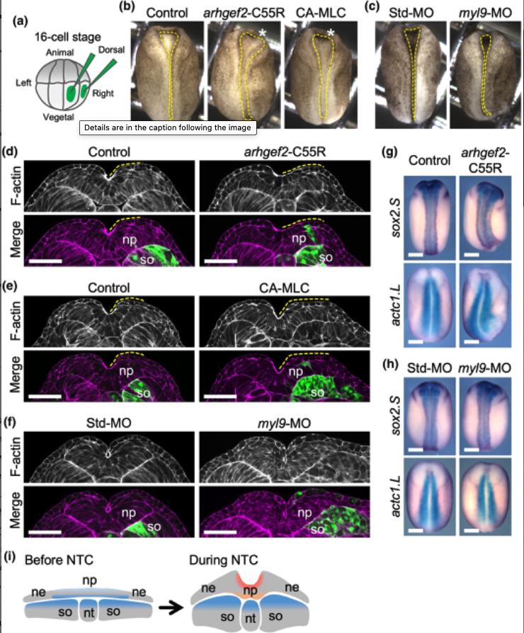 Experimental increase in mesoderm stiffness delays neural tube closure. (a) Schematic of microinjection. mRNAs or morpholino oligonucleotides (MOs) were injected into two right dorso-vegetal blastomeres of 16-cell-stage embryos, which give rise to the notochord and somites. Enhanced green fluorescent protein (EGFP) mRNA was co-injected as a tracer. (b, c) Dorsal views of unilaterally injected embryos at stages 1617, anterior is to the top. Dashed lines indicate the outline of the neural plate. (b) Injection of arhgef2-C55R or a constitutively active form of the myosin light chain (CA-MLC) delayed the neural tube closure compared with the control; n=0/23 (control); 17/19 (arhgef2-C55R); 10/13 (CA-MLC); parhgef2-C55R=2.0109; pCA-MLC=2.3106). The asterisks indicate the opened neural tube on the injected side. (c) myosin light chain 9 (myl9)-MO did not show an effect; n=0/16 (Std-MO); n=1/20 (myl9-MO); p=1. (df) Phalloidin-stained transverse sections through the neural plate at stages 16 (d, e) and 19 (f), unilaterally injected with arhgef2-C55R (d), CA-MLC (e), and myl9-MO (f). The bottom panels show the merged images with EGFP (green). The dashed lines indicate the outline of the neural plate on the injected side. np, neural plate; so, somites. Scale bars: 100m. (g, h) In situ hybridization analysis of embryos injected with arhgef2-C55R (g) and myl9-MO (h). Dorsal views showing the expression of sox2.S, a pan-neural marker (top), and actc1.L, a somite marker (bottom). Anterior is to the top. Expression patterns were similar between the manipulated and control embryos. n=7 (control, sox2.S); n=4 (arhgef2-C55R, sox2.S); n=7 (control, actc1.L); n=4 (arhgef2-C55R, actc1.L); n=6 (Std-MO, sox2.S); n=6 (myl9-MO, sox2.S); n=7 (Std-MO, actc1.L); n=5 (myl9-MO, actc1.L). Scale bars: 500m. p-values were calculated using Fisher's exact test. p-values for pairwise comparisons were adjusted using Holm's method. (i) A proposed model for the relationship of stiffness between the neural plate (np) and surrounding tissues in neural tube closure (NTC). Before NTC (left), the apical surface of the neural plate (light blue) is softer than the basal surface and mesodermal tissues (blue). During NTC (right), stiffness increases significantly at the apical surface of the neural plate (red). The basal surface (orange) shows intermediate stiffness between the apical surface and mesodermal tissues (blue). |