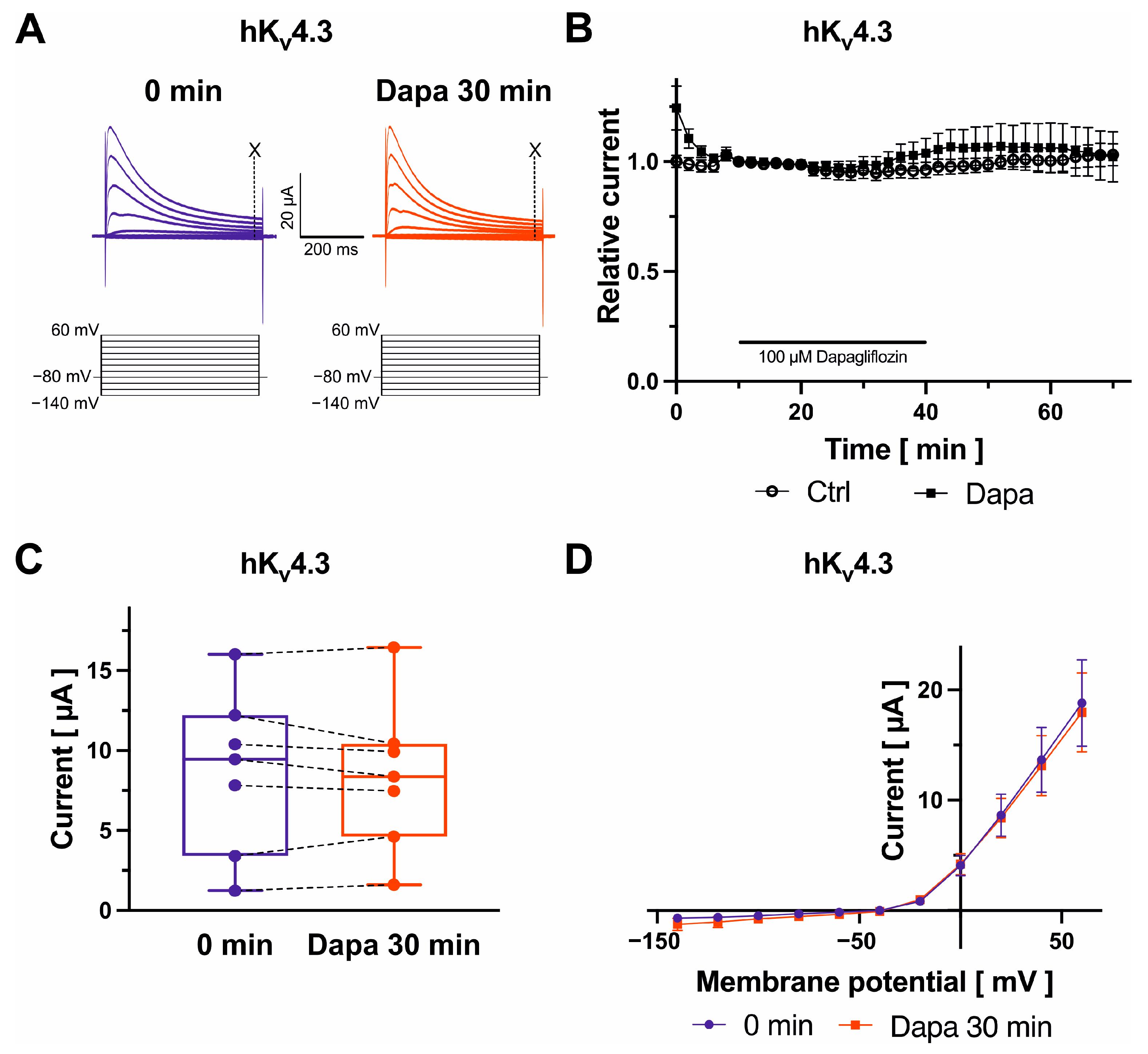 Figure 3. Biophysical effects of dapagliflozin on Kv4.3 channels. Representative current traces evoked with indicated voltage protocols with time-point of analyses marked with dashed lines and “X” (A) and maximum current amplitudes at +20 mV are shown before and after superfusion of cells with 100 µM dapagliflozin ((B) Dapa n = 7, Ctrl n = 5; (C) n = 7) for 30 min. Currents were normalized to the last current measurement under control conditions (panel (B)). Box plots represent median, 25th, and 75th percentiles, as well as minimum and maximum measured value. Dots in panel (C) represent raw data. Current–voltage relationships are displayed in panel (D).