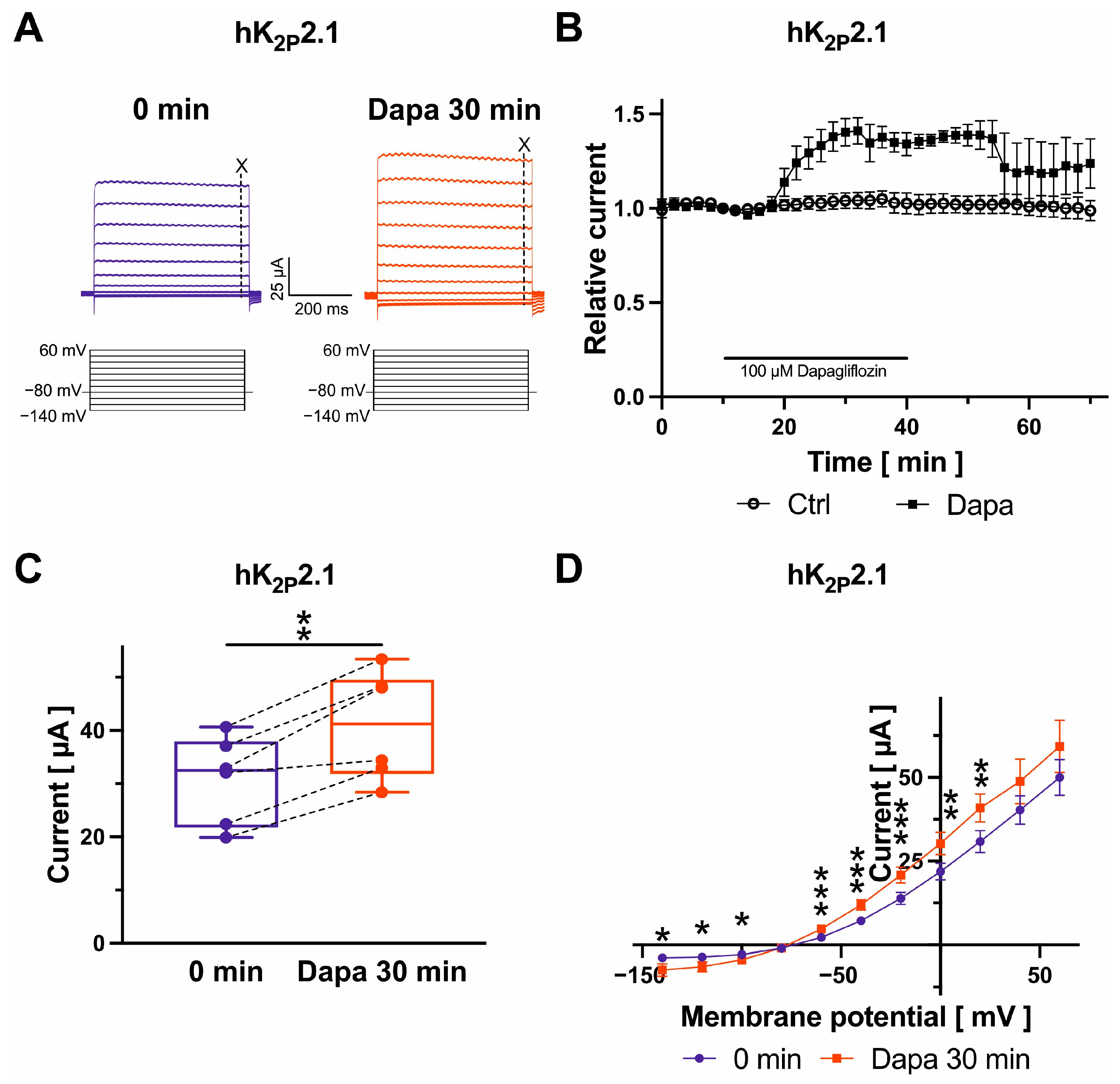 Figure 5. Biophysical effects of dapagliflozin on K2P2.1 channels. Representative recordings evoked with indicated voltage protocols with time-point of analyses marked with dashed lines and “X“ (A) and maximum current amplitudes at +20 mV are provided before and after superfusion of cells with 100 µM dapagliflozin ((B) Dapa n = 6, Ctrl n = 7; (C) n = 6) for 30 min. Currents were normalized to the last current measurement under control conditions (panel (B)). Box plots represent median, 25th, and 75th percentiles, as well as minimum and maximum measured value. Dots in panel (C) represent raw data. Current–voltage relationships are displayed in panel (D); * p < 0.05, ** p < 0.01, *** p < 0.001 (please note that p values are not indicated in panel (B) for clarity of data presentation).