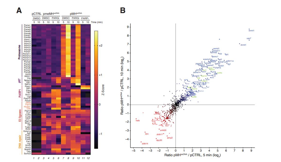 Genes referenced: adrm1 anapc15 aplf atm aunip brca1 btaf1 cab39 ccnc cdc25b chek1 chfr chtf8 ctrl cul1 cul4a cul4b cyb5r4 dbf4 dclre1a ddi2 ddx11 drap1 dscc1 dtx3l eme1 esco1 fancm fbxl12 fen1 foxm1 fzr1 hira hltf hpf1 huwe1 kdm8 lig1 lig3 mus81 naa30 nbn nsfl1c nup42 otud5 parg parp1 parp12.3 parp9 paxip1 pds5b pnkp pold1 pold2 pold3 pole3 pole4 psma1 psma2 psma3 psma5 psma6 psma7 psmc1 psmc2 psmc3 psmc4 psmc5 psmc6 psmd11 psmd12 psmd13 psmd14 psmd2 psmd3 psmd4 psmd6 psmd7 psmd8 rad18 rad51d rad54l rnaseh2a rnf41 rnf8 rprd1b scai sfr1 smarcd1 sprtn stag2 sumo3 tdp1 tiprl top1 trafd1 trip12 uba3 ubb uchl5 ufd1 uhrf1 usp2 usp37 vcp xrcc1 xrcc5 xrcc6